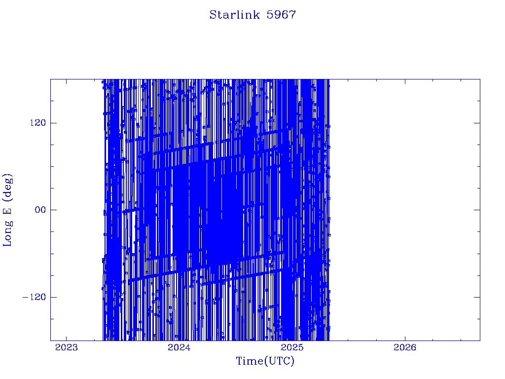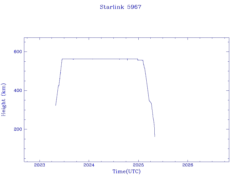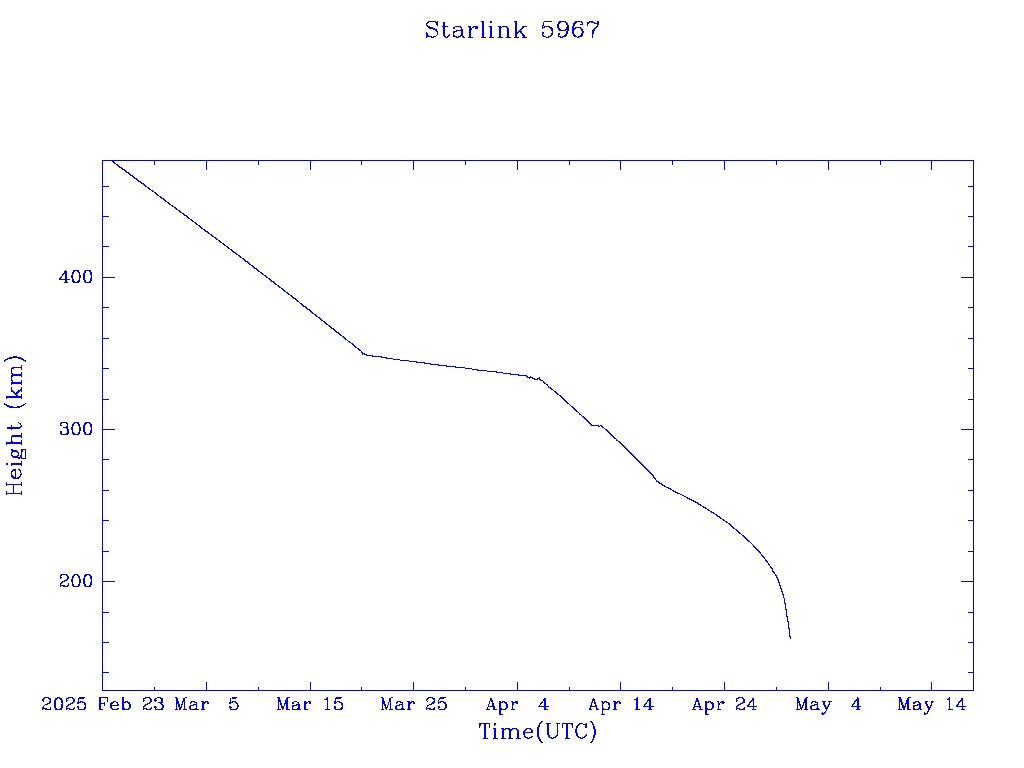 | Starlink 5967 | S56330 | R | 2023 Apr 27 | 2025 Apr 17? | 2025 May 1 |  |  |  |