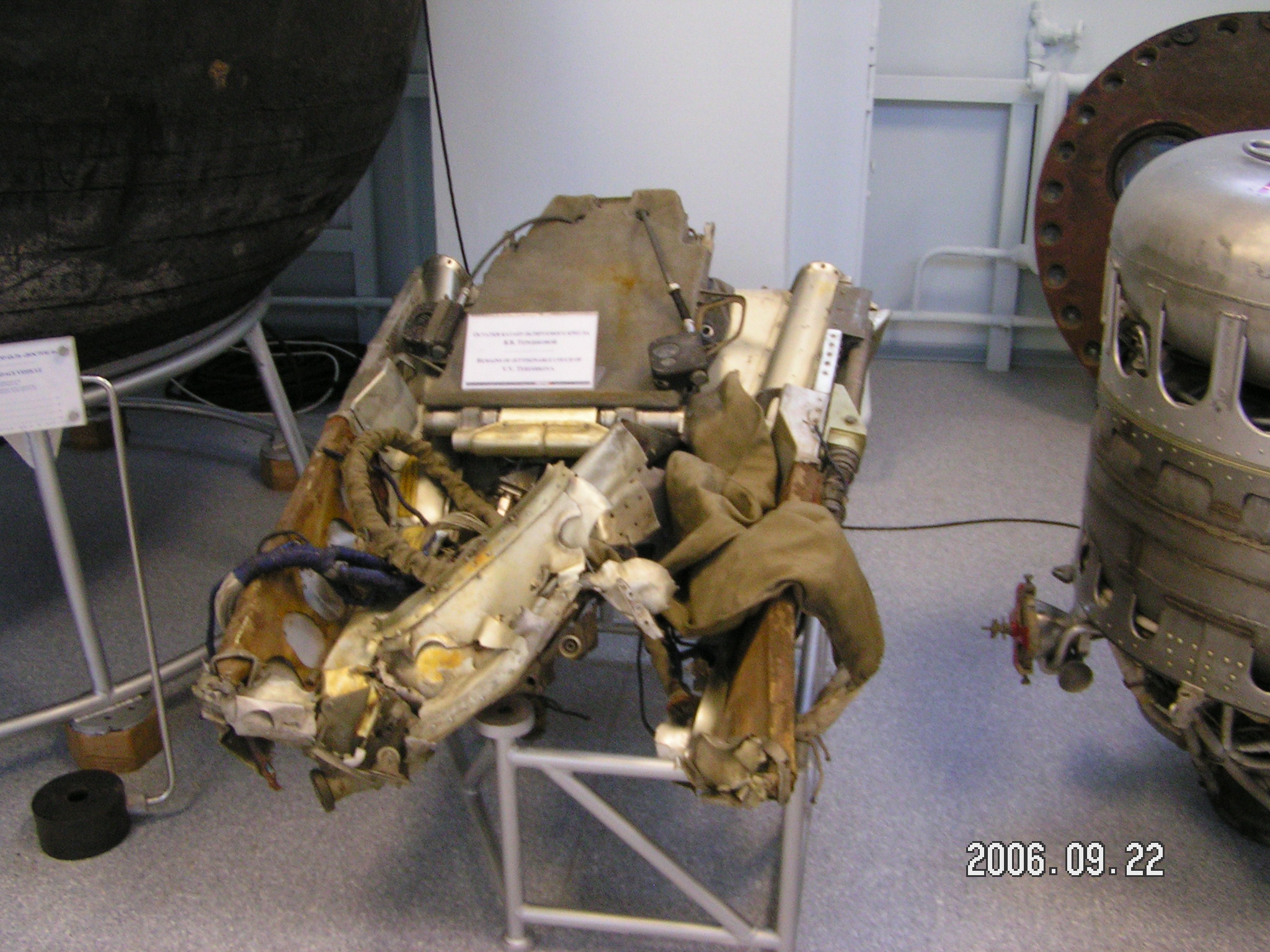Tereshokva's ejection seat, mangled. The cosmonaut separated from the ejection seat and descended by parachute; the ejection seat crashed to Earth. On other Vostok flights it was completely destroyed but in this case it landed in a lake or pond and was still recognizable.