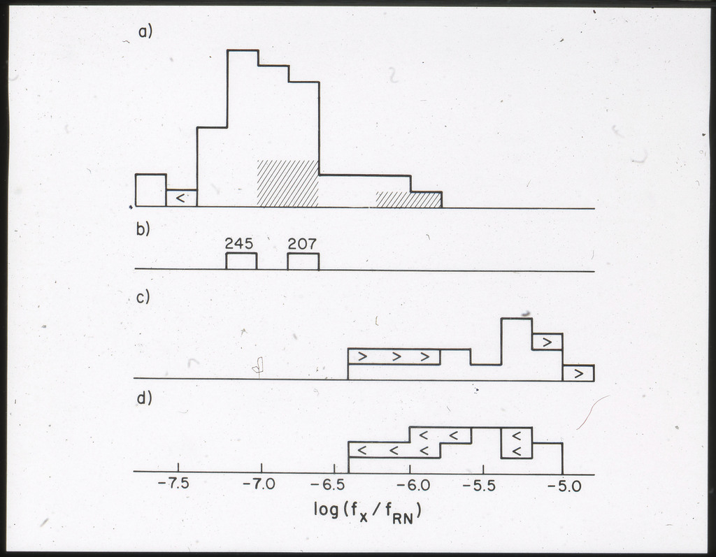 E/996 Distribution (a) of the X-ray luminosities L_x for the galaxies in the sample, and (b) Distribution of the X-ray to optical flux ratios of f_x/f_B. The hatched box represents NGC6876 for which only a Harvard Magnitude is listed in deVaucouleurs, de Vaucouleurs, and Corwin (1976). |