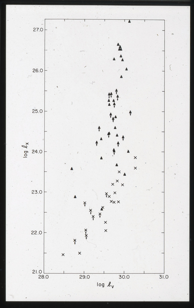 E/1001 The monochromatic X-ray luminosity is plotted against the optical luminosity for normal elliptical and S0 galaxies (this sample, x) and the 3CR galaxies (Fabbiano et al. 1984). The V band magnitudes have been used for consistency with the data for 3CR galaxies. |