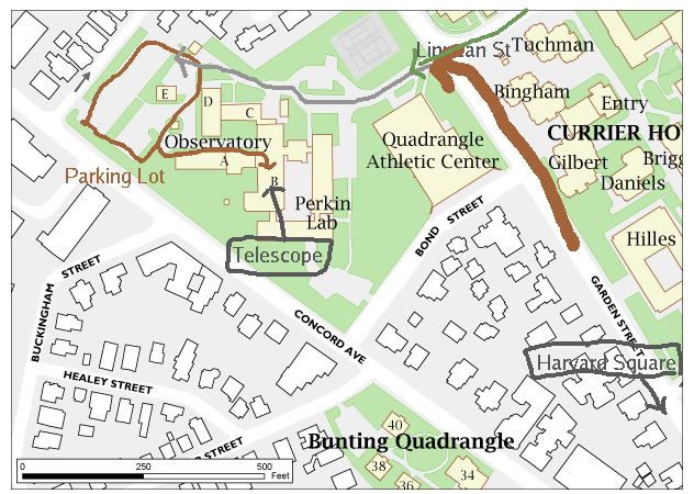 You can get to the Observatory from Harvard Square up Garden St (red path, with cyan one-way detour if you are driving) or from Porter Square (green path), down Mass Ave and then right on Linnean. The Obs entrance is at the intersection of Garden and Linnean. You'll see "Perkin Lab for Astrophysics" at the entrance, don't ask why. See the detailed map below.