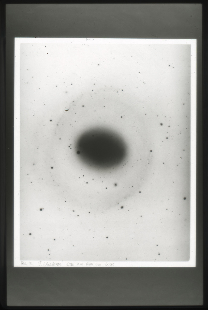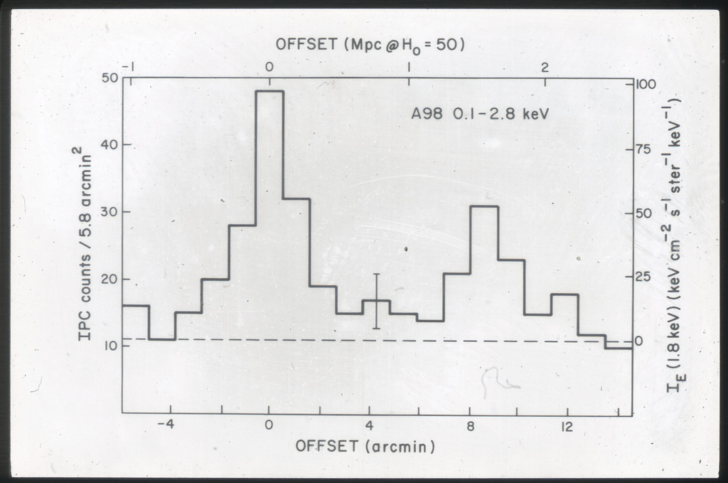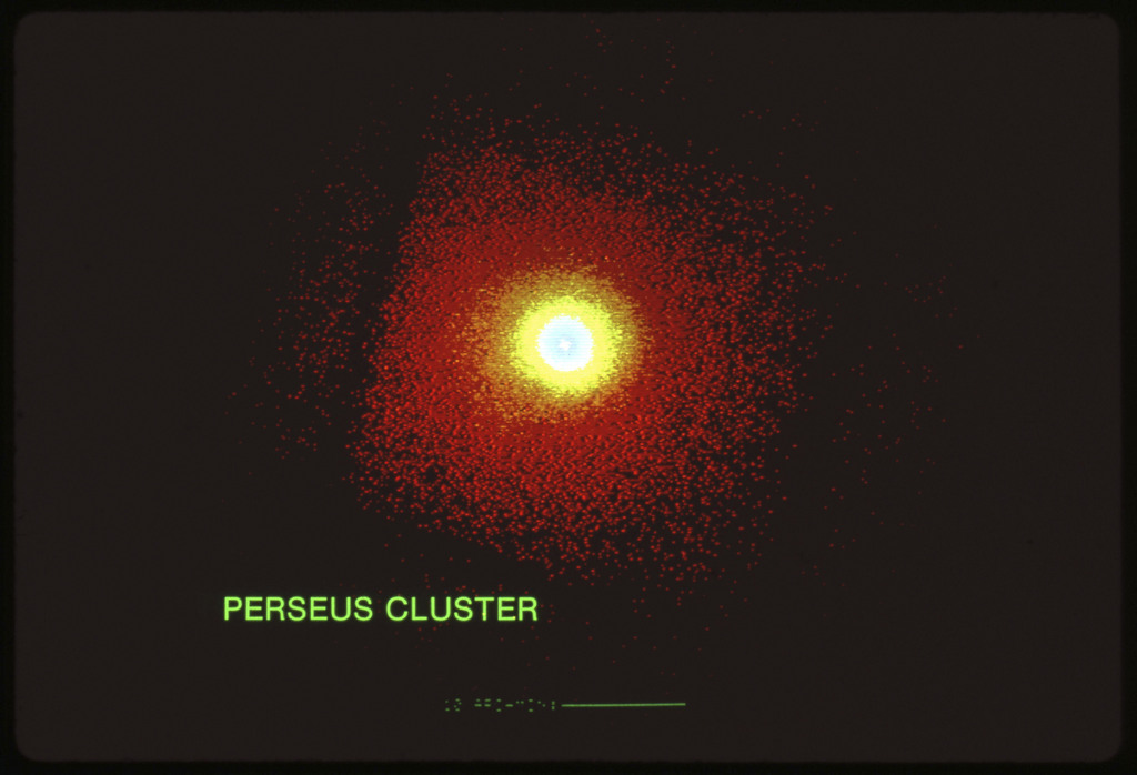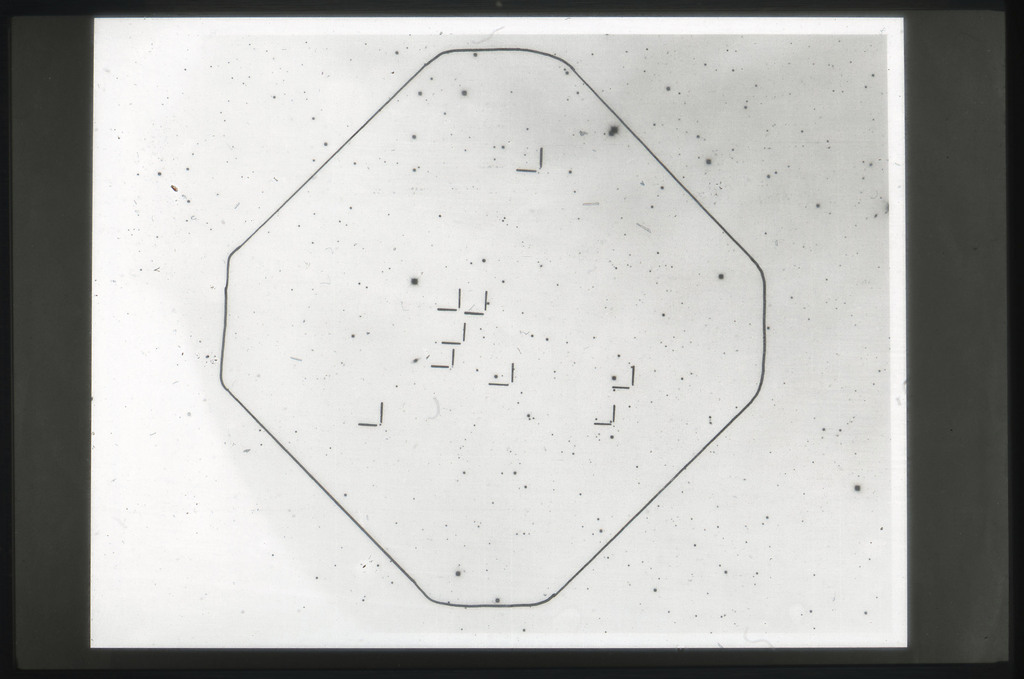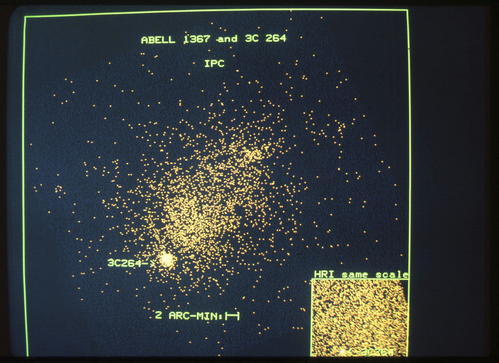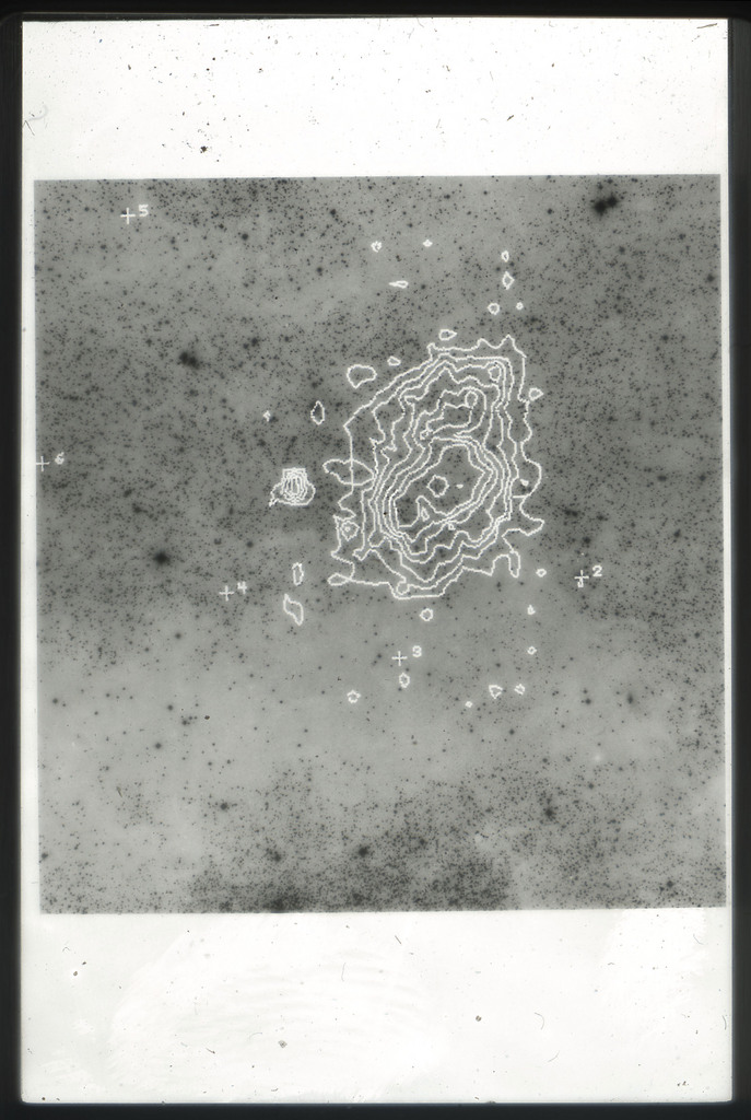 E/1003 A 1367. Optical picture of the cluster contains several hundred individual galaxies, the brightest of which are seen as the extended or fuzzy dark spots. |