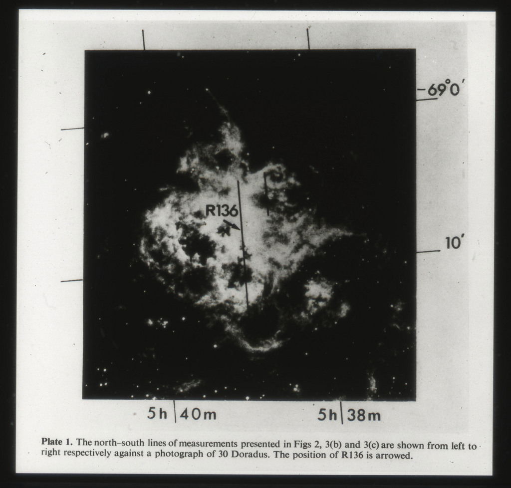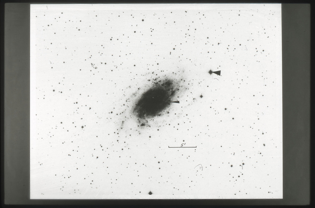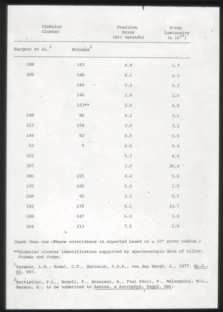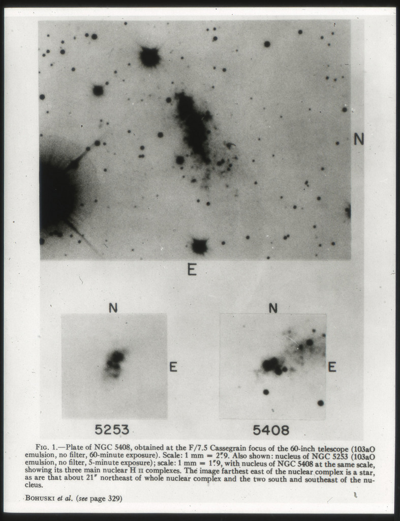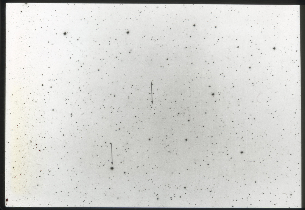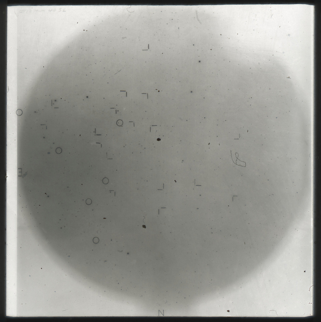 E/1003 A 1367. Optical picture of the cluster contains several hundred individual galaxies, the brightest of which are seen as the extended or fuzzy dark spots. |
