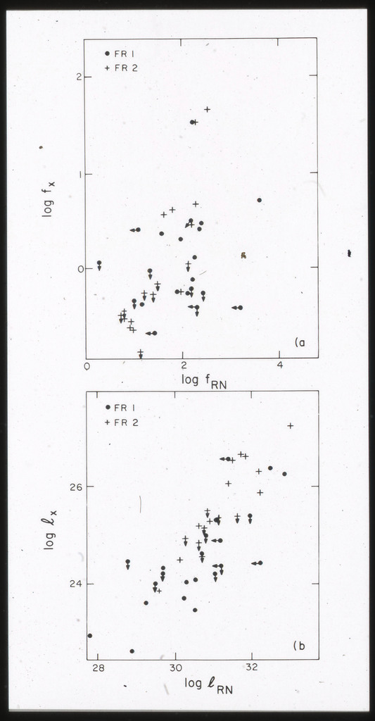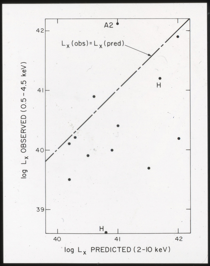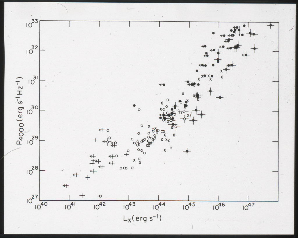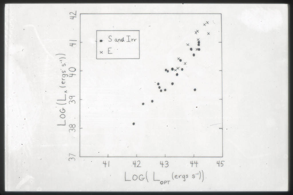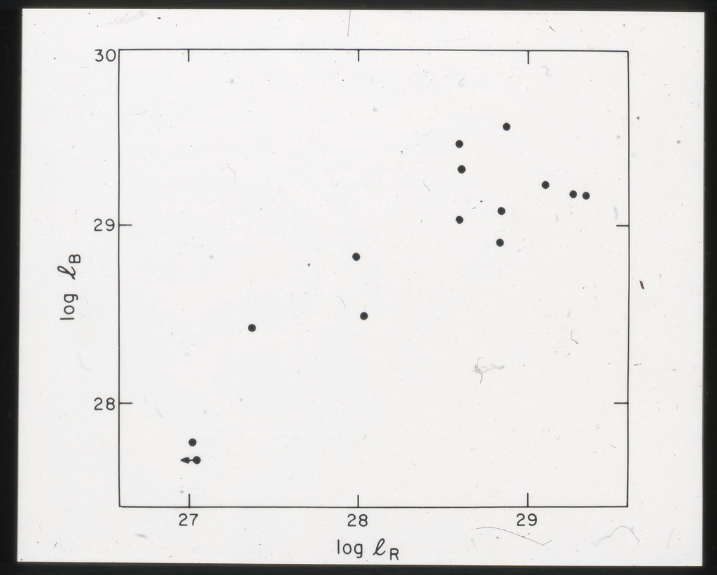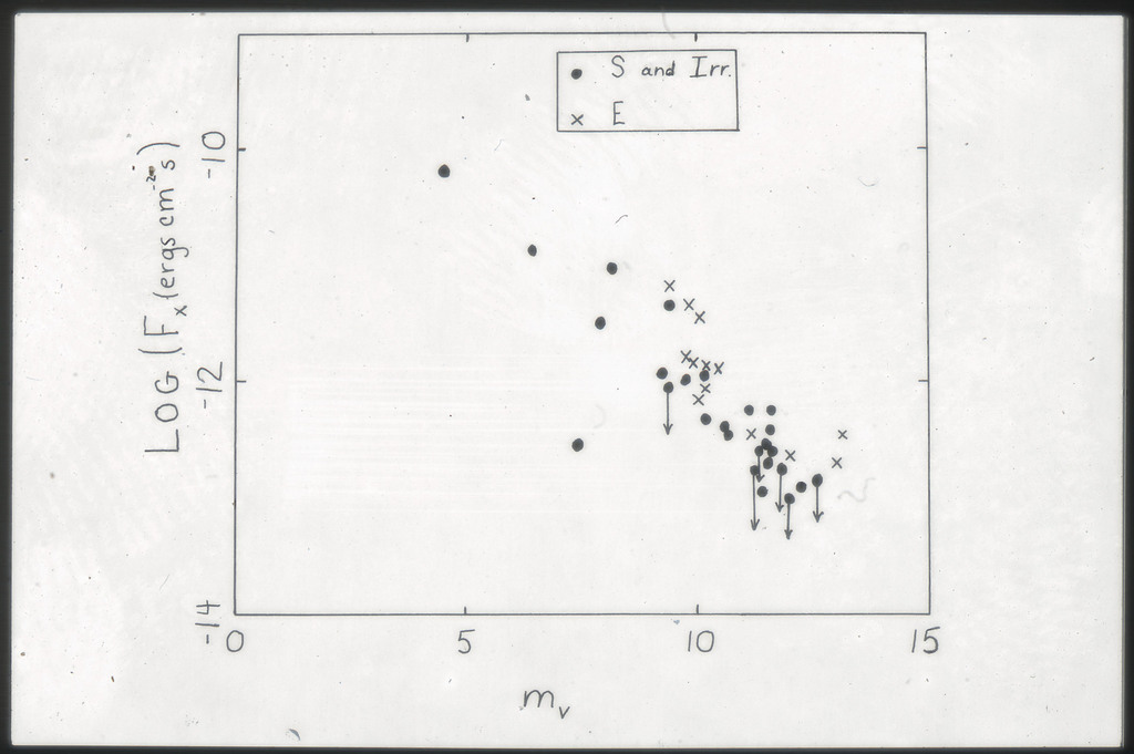 E/1001 The monochromatic X-ray luminosity is plotted against the optical luminosity for normal elliptical and S0 galaxies (this sample, x) and the 3CR galaxies (Fabbiano et al. 1984). The V band magnitudes have been used for consistency with the data for 3CR galaxies. |