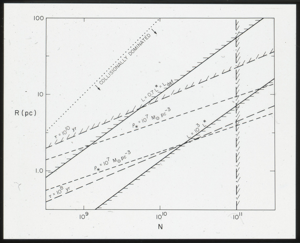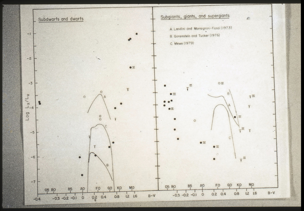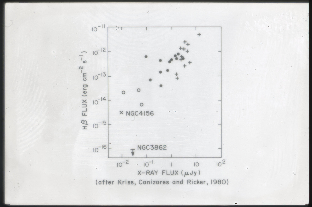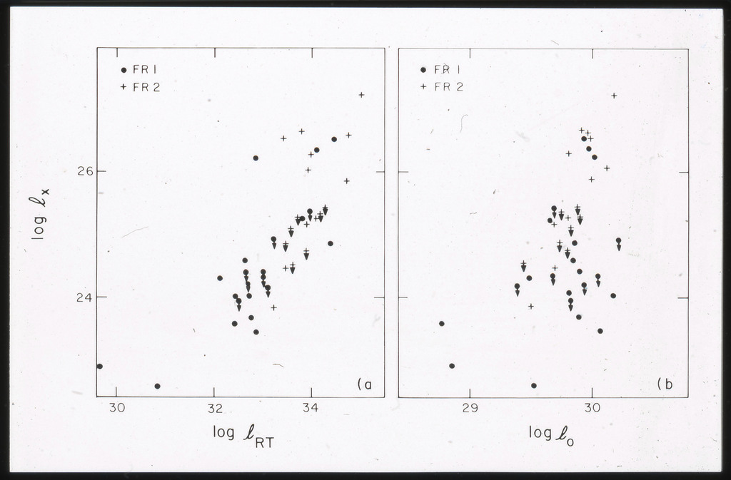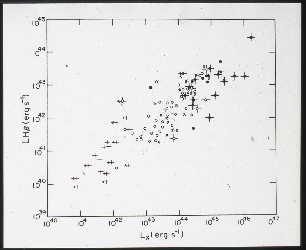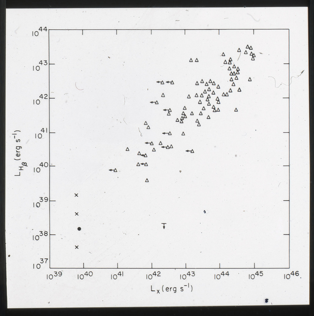 E/1001 The monochromatic X-ray luminosity is plotted against the optical luminosity for normal elliptical and S0 galaxies (this sample, x) and the 3CR galaxies (Fabbiano et al. 1984). The V band magnitudes have been used for consistency with the data for 3CR galaxies. |