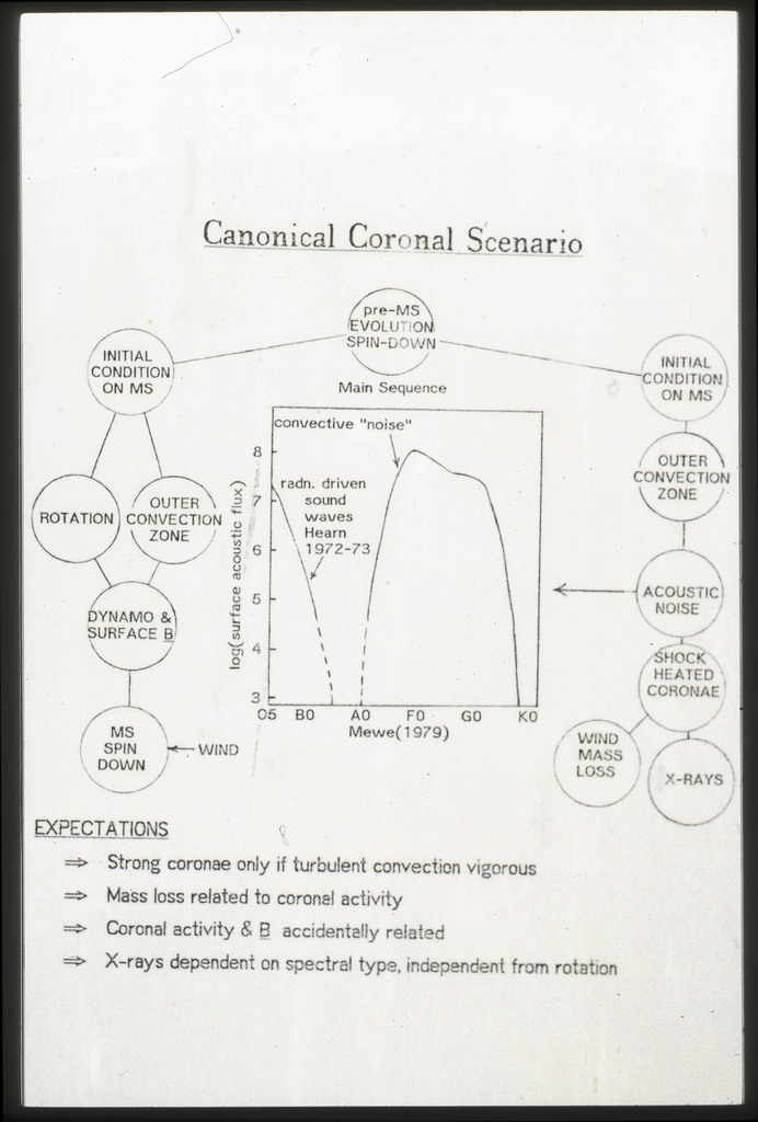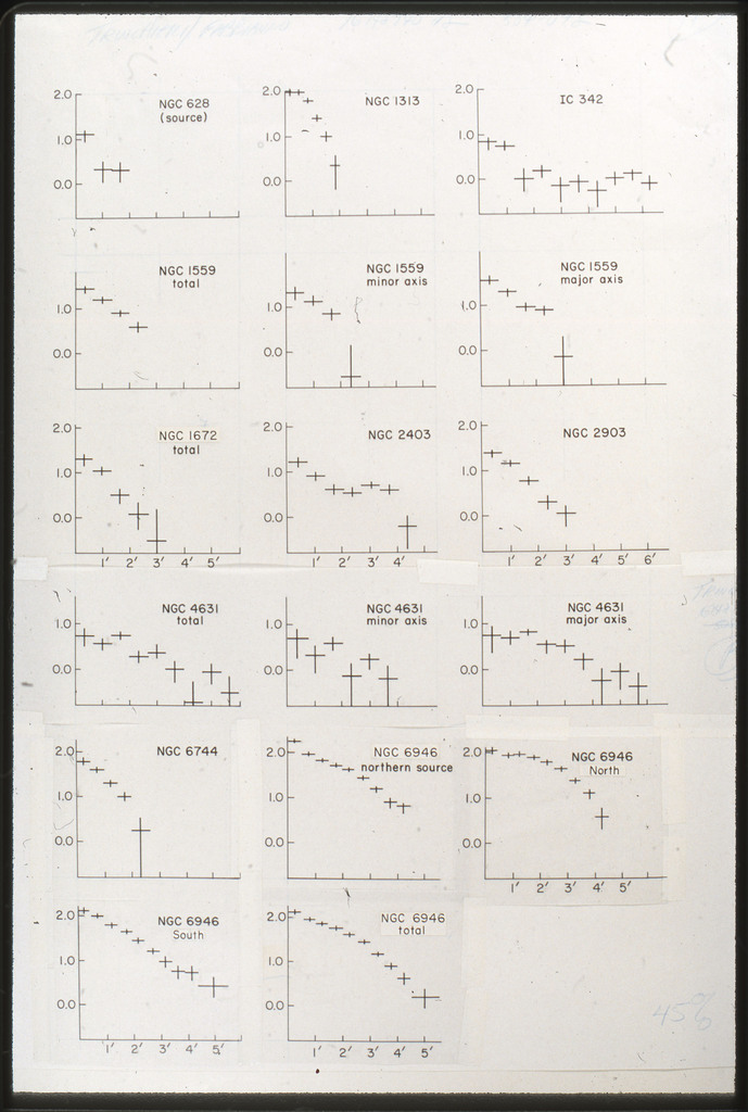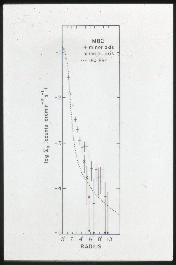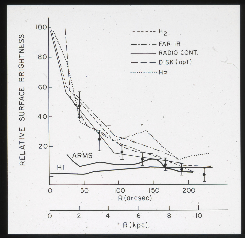 E/1008 Comparison between the x-ray, H alpha, blue light (disk and arms), far-infrared, neutral hydrogen, molecular hydrogen (derived from CO) and 21~cm radio continuum surface brightness profiles. The x-ray points are plotted on a composite of Figure~6 from Scoville and Young (1983). The x-ray data points have been corrected for the inclination of M51 (i = 20 deg) as in Scoville and Young (1983). X-ray points for R < 2~kpc are not plotted because off scale. All curves have been arbitrarily normalized. |