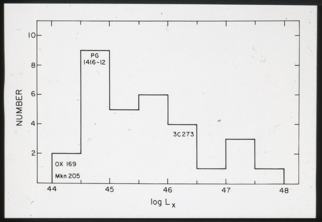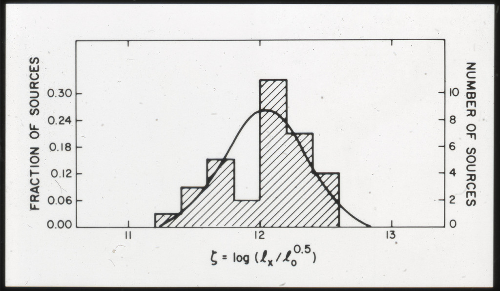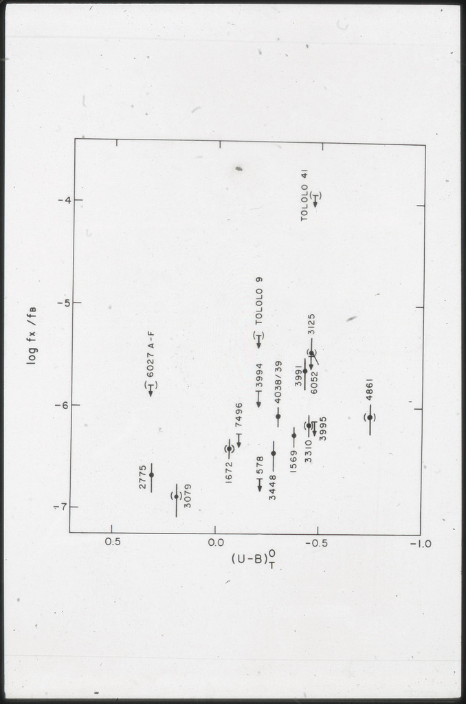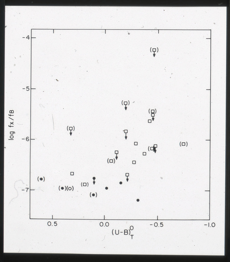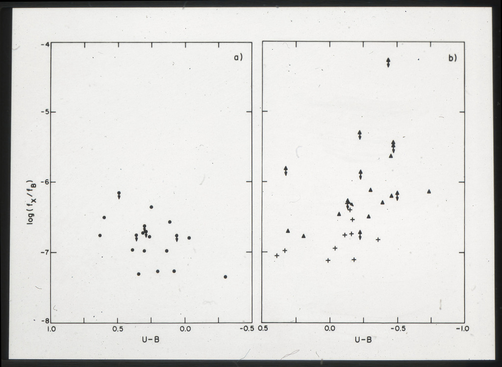 E/996 Distribution (a) of the X-ray luminosities L_x for the galaxies in the sample, and (b) Distribution of the X-ray to optical flux ratios of f_x/f_B. The hatched box represents NGC6876 for which only a Harvard Magnitude is listed in deVaucouleurs, de Vaucouleurs, and Corwin (1976). |