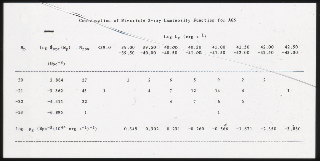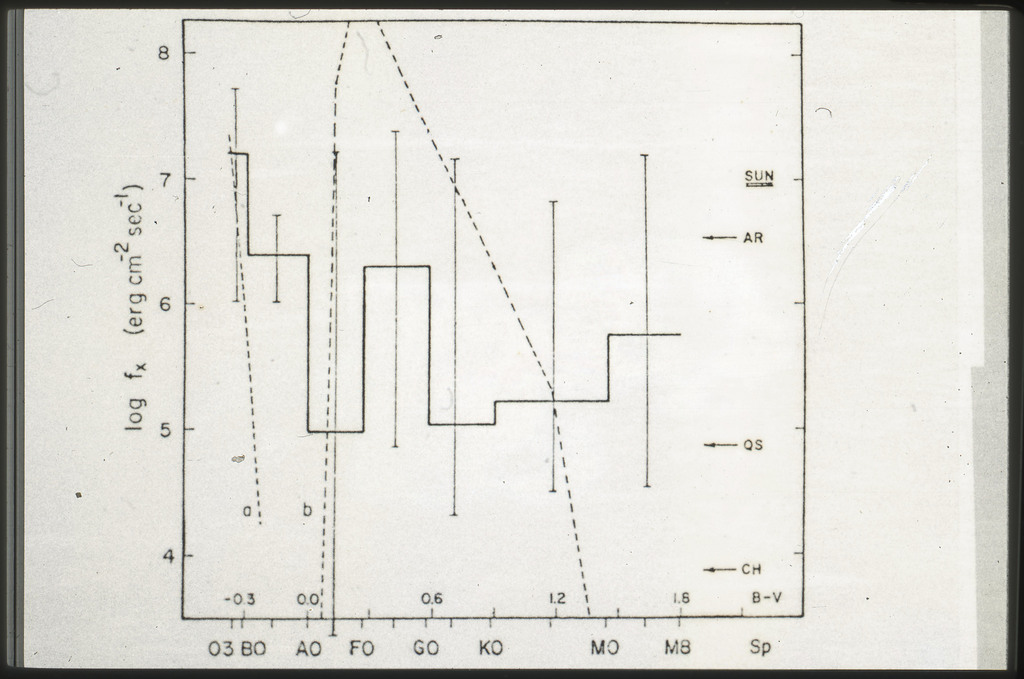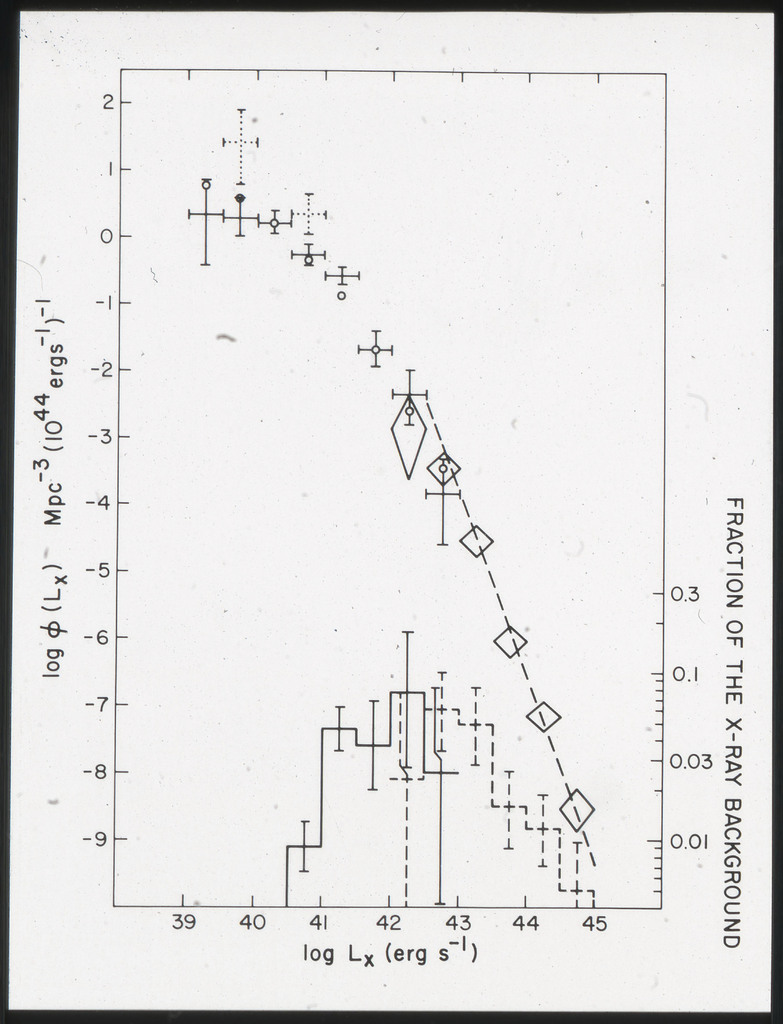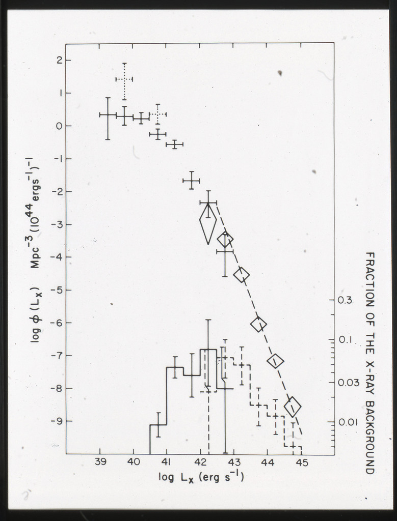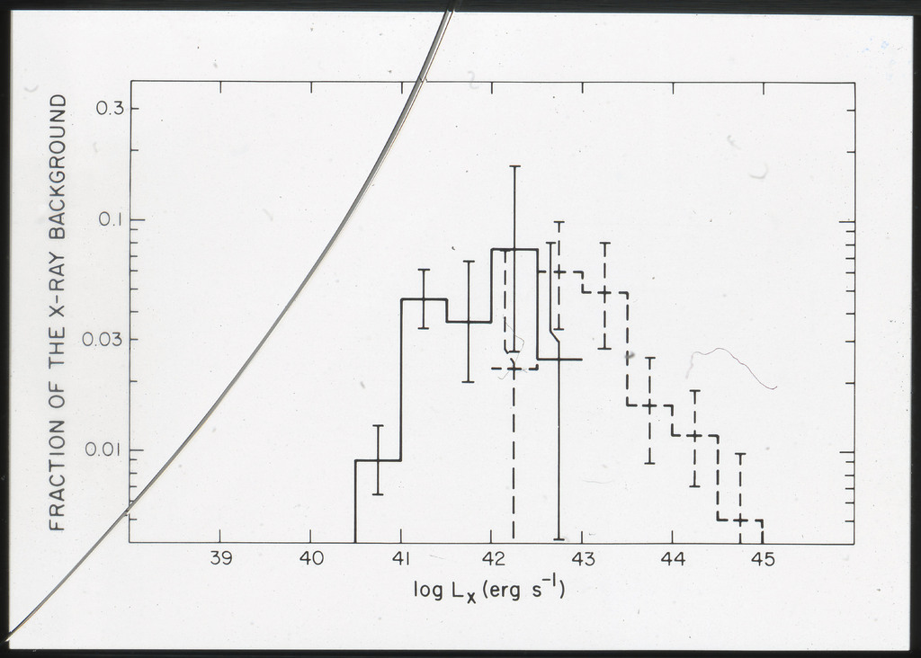 E/996 Distribution (a) of the X-ray luminosities L_x for the galaxies in the sample, and (b) Distribution of the X-ray to optical flux ratios of f_x/f_B. The hatched box represents NGC6876 for which only a Harvard Magnitude is listed in deVaucouleurs, de Vaucouleurs, and Corwin (1976). |