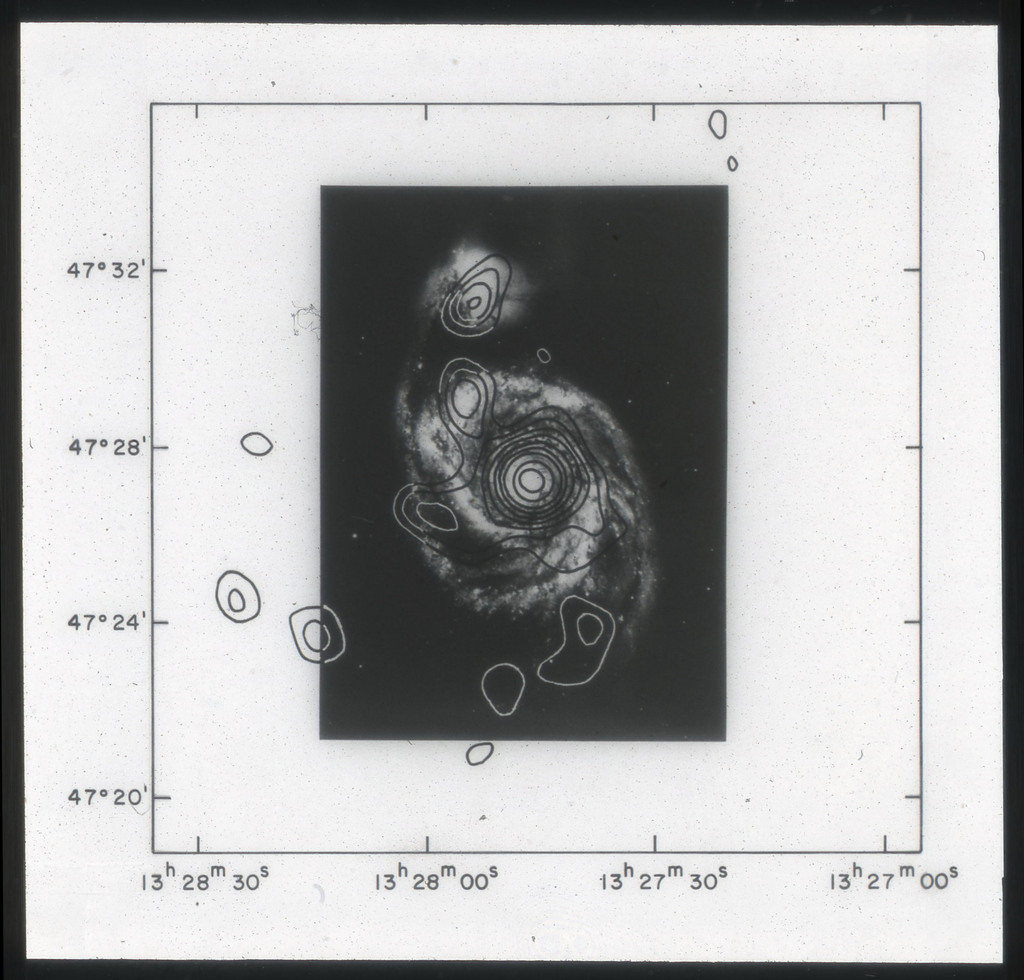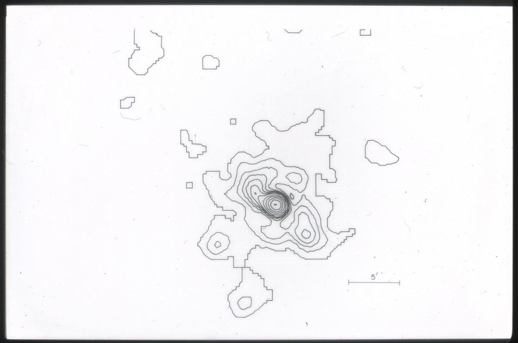 E/1004 X-ray contour map of M51 and its companion (NGC~5195) superposed on the optical image from the Hubble Atlas of Galaxies (Sandage 1961). The x-ray data have been smoothed with a gaussian with sigma = 24". The first contour is 2 sigma above field background; 3, 4, 5, 7, 9, 11, 13, 15 \sigma's are then plotted. |