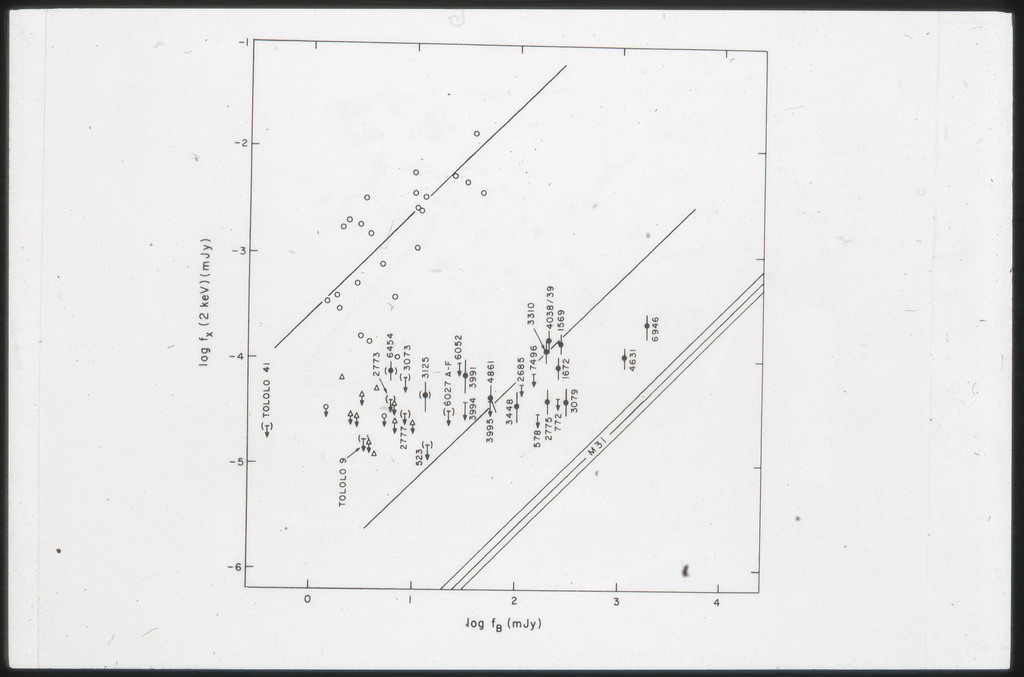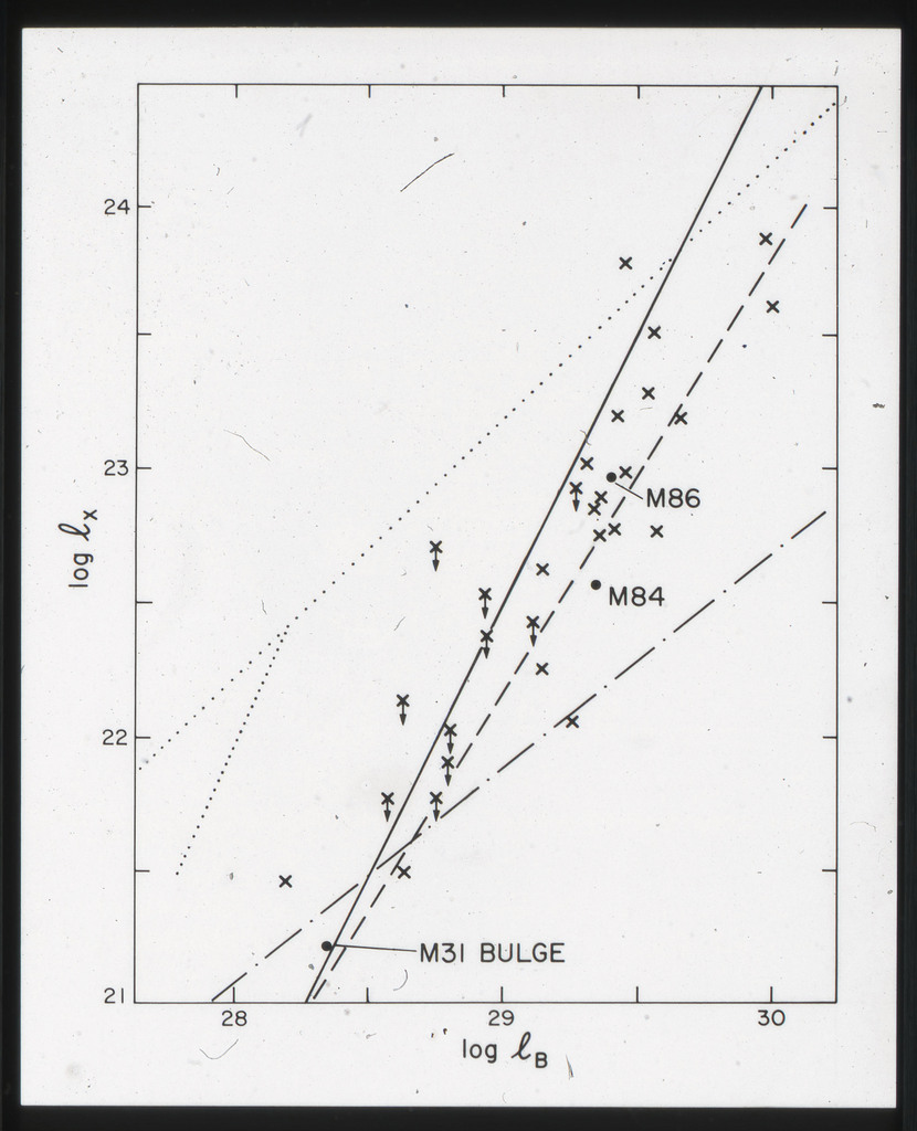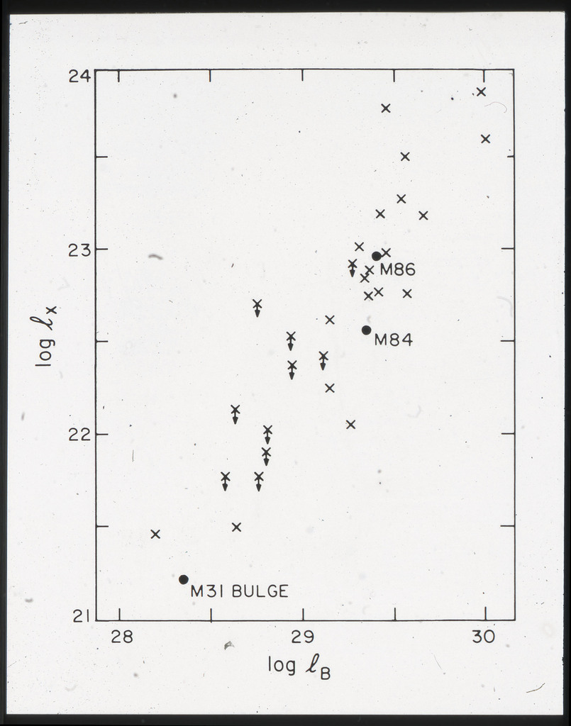 E/997 (a) Plot of the X-ray monochromatic (2 keV) luminosity against the blue luminosity in units of erg/s.Hz. M84, M86 and the bulge of M31 are also shown. |