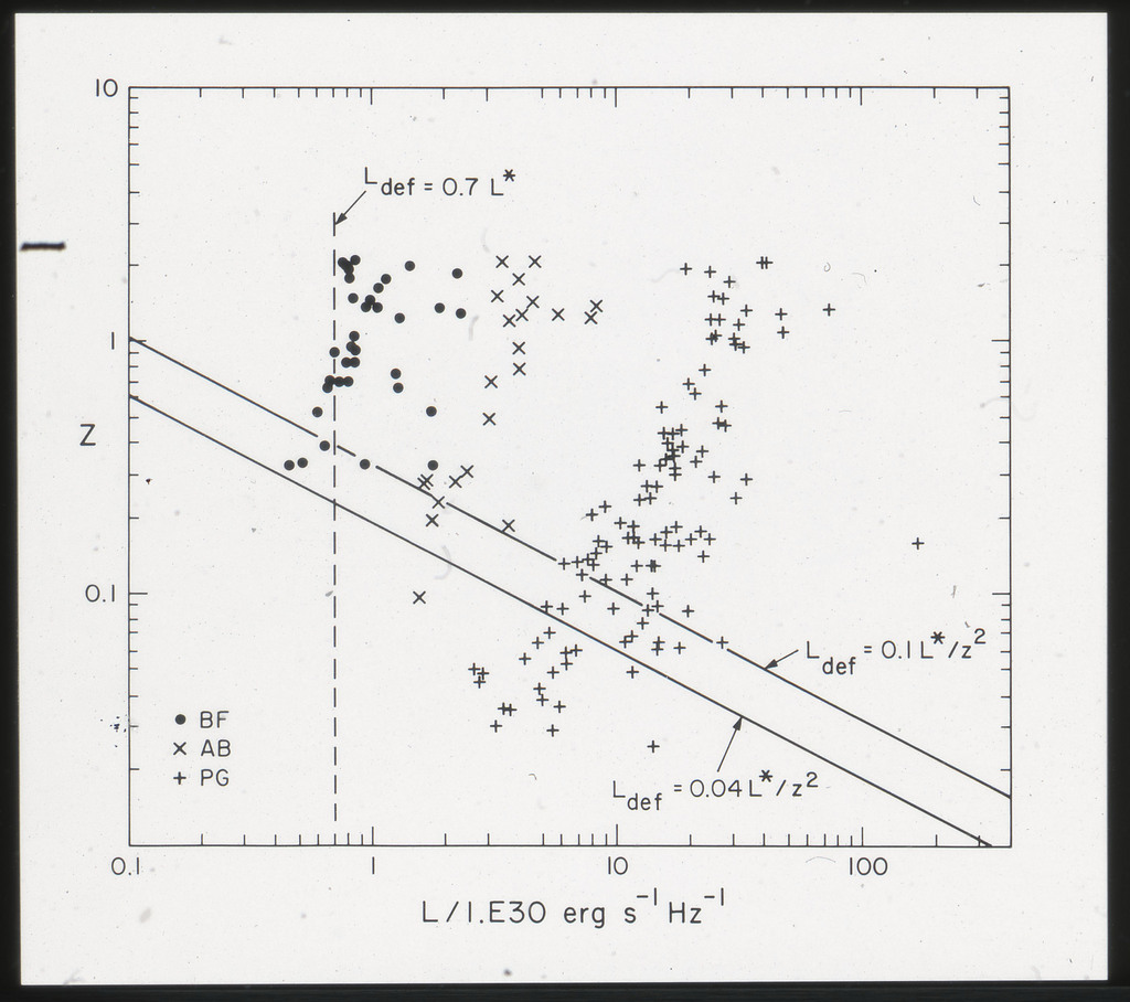 E/1002 The monochromatic X-ray luminosity of 3CR quasars and 3CR galaxies plotted as a function of optical luminosity. Dashed line represents the best fit to the 3CR quasar data. The solid lines represent how this best fit is modified when the effect of the whole galaxy is considered for three different optical luminosities. |