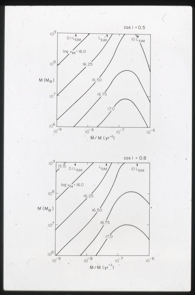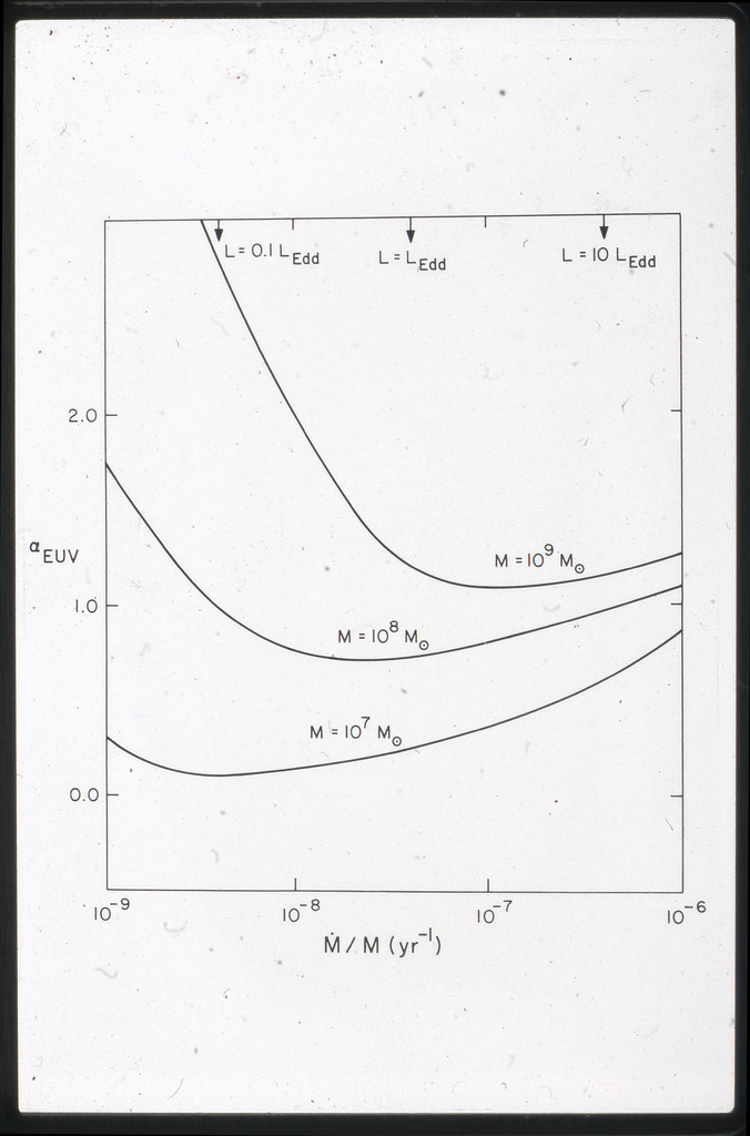 E/1062 Dependence of disk spectrum on accretion rate for assumed value of the flux in optical range (M.M=10^9). |