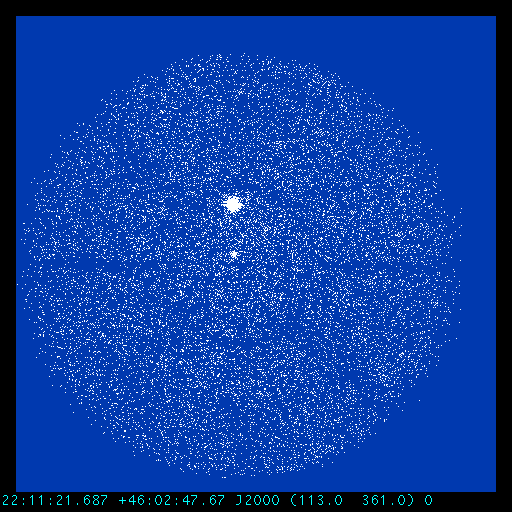 The event list we use for these examples is an archival ROSAT PSPC image of AR Lac. Note the two bright sources in the field of fiew, and the pattern of the telescope ribs, which is smeared out due to aspect wobble.