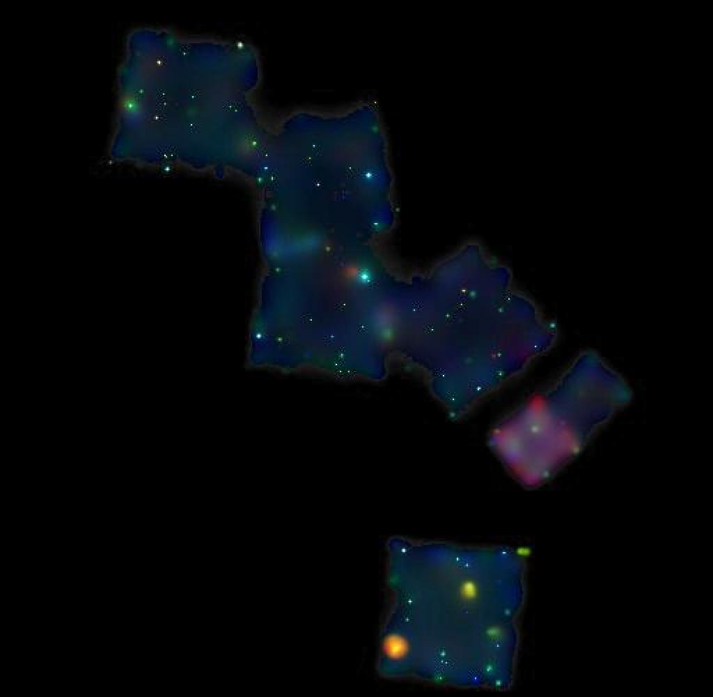 This image shows a mosaic of our Cycle 3 Chandra observations. Red: 0.2-1.0 keV; Green: 1.0-2.0 keV; Blue: 2.0-8.0 keV. The pink square is a back illuminated chip, which has different energy sensitivity.
