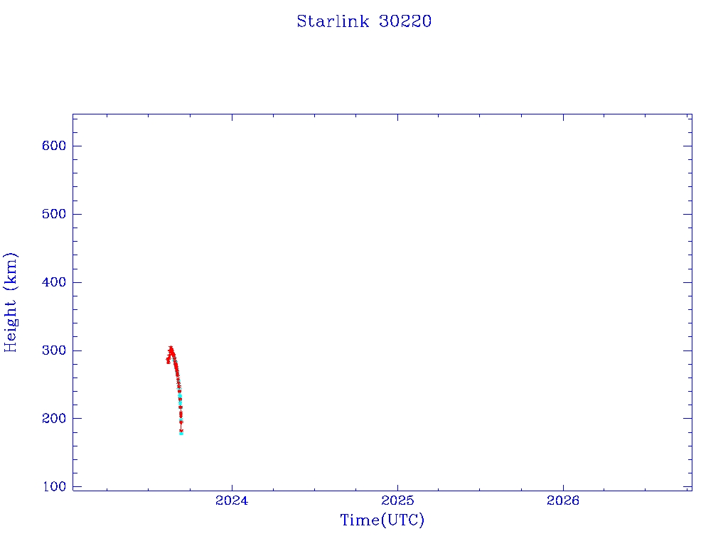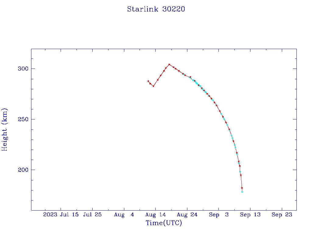| Starlink 30220 | S57619 | F | 2023 Aug 11 | 2023 Aug 18 | 2023 Sep 10 |  |  |  |