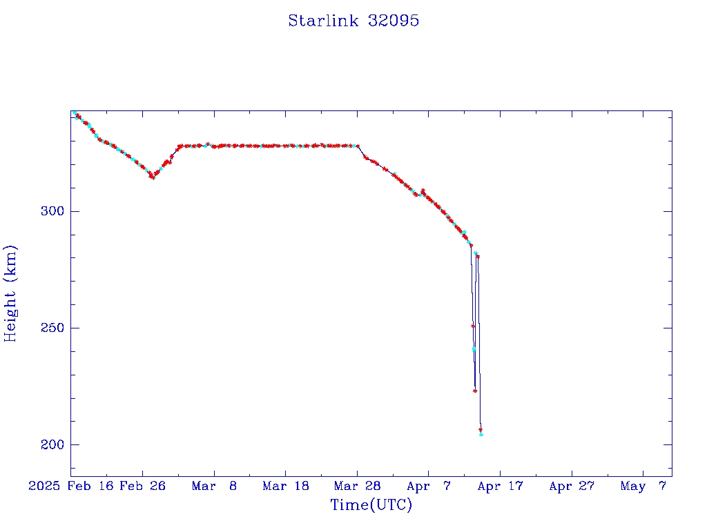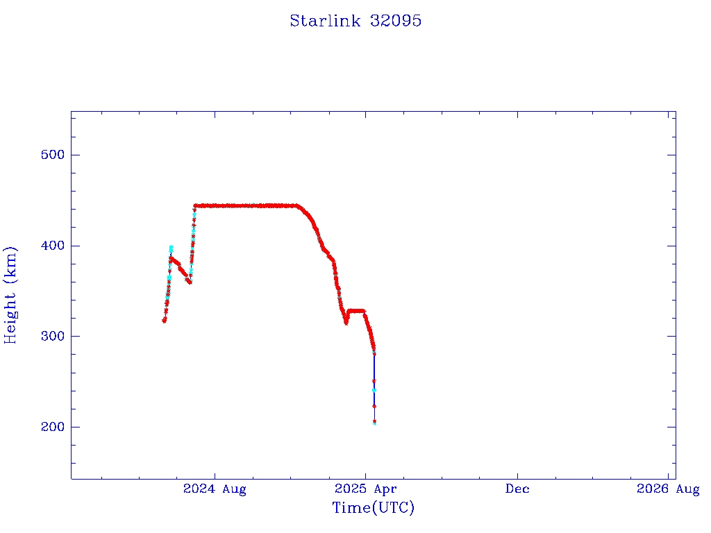 | Starlink 32095 | S59692 | R | 2024 May 8 | 2025 Apr 13? | 2025 Apr 24 |  |  |  |