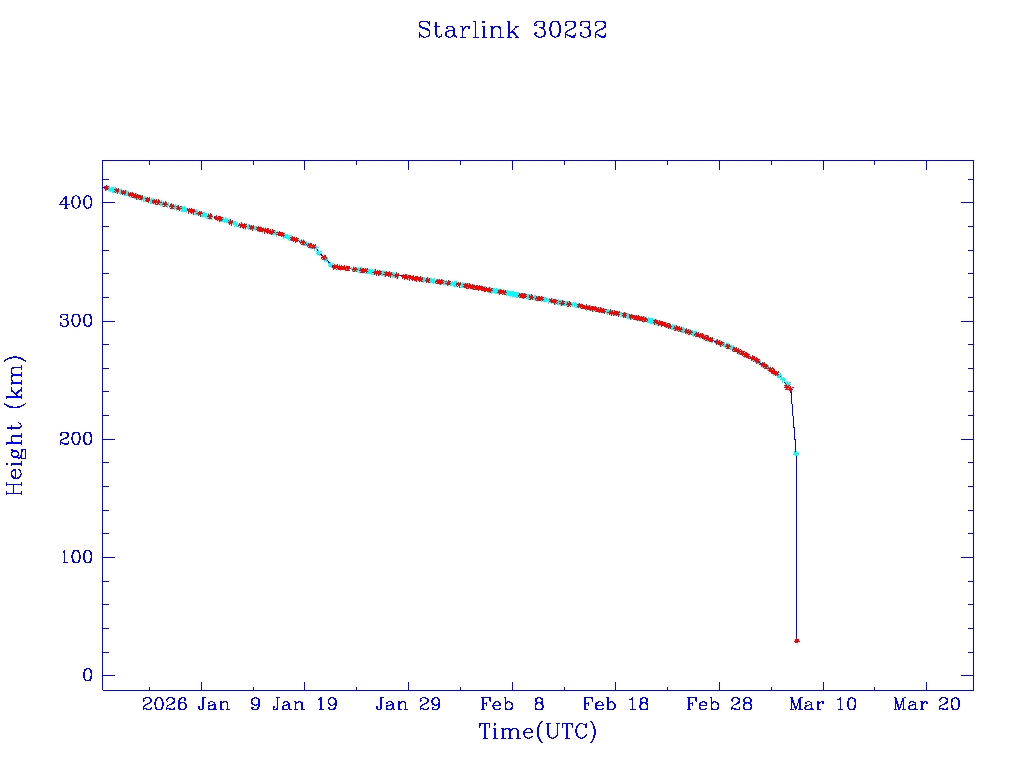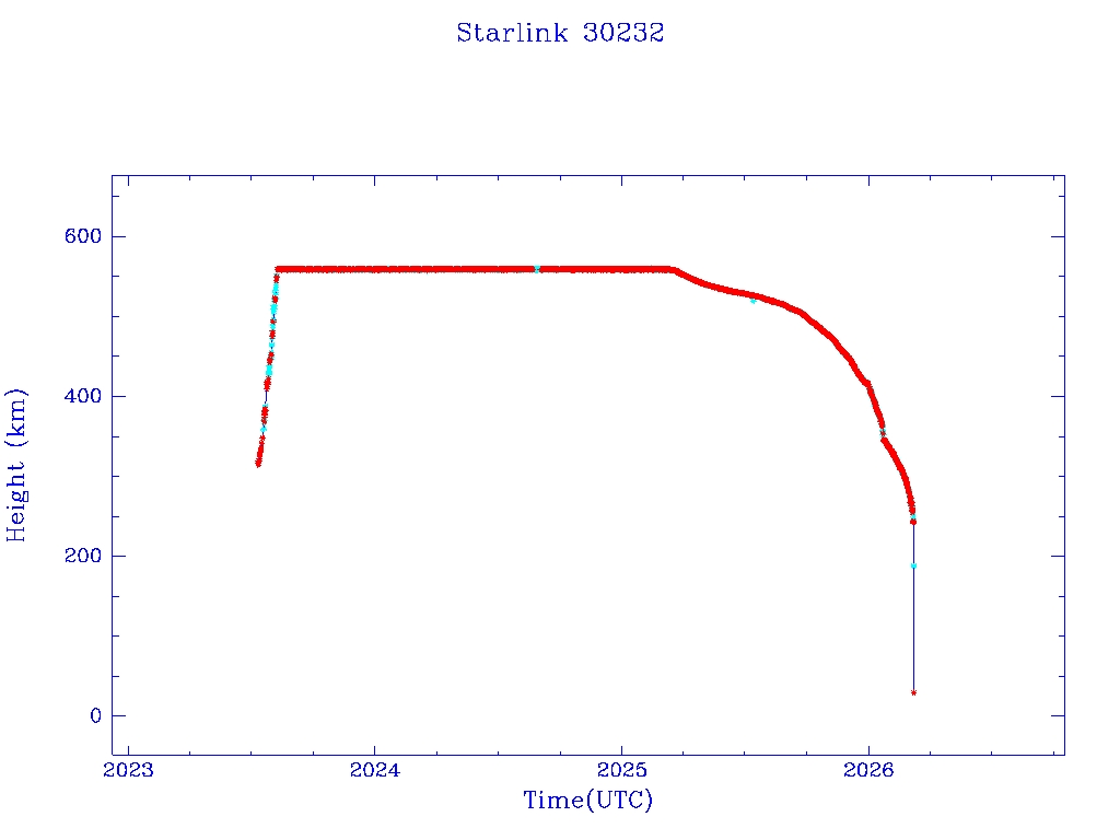 | Starlink 30232 | S57303 | R | 2023 Jul 10 | 2026 Jan 21? | 2026 Mar 7 |  |  |  |