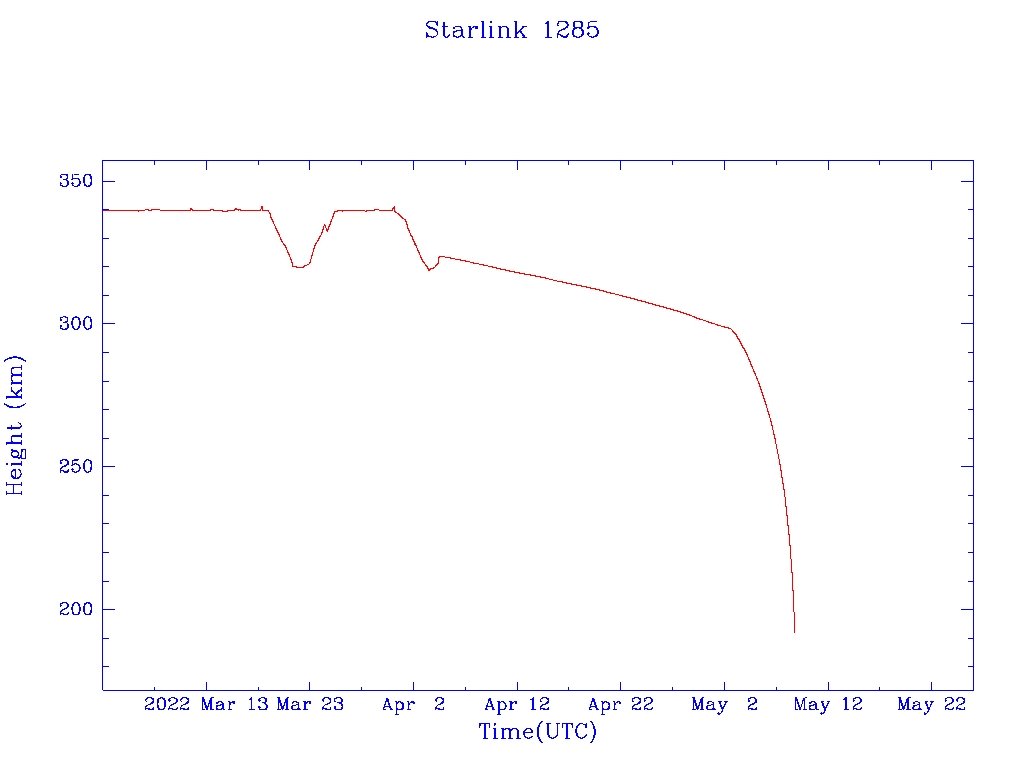 | Starlink 1285 | S45410 | R | 2020 Mar 18 | 2022 May 2 | 2022 May 9 |  |  |  |