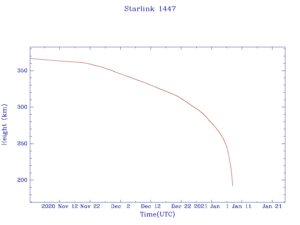 | Starlink 1447 | S45664 | R | 2020 Jun 4 | 2020 Jul 5 | 2021 Jan 8 |  |  |  |