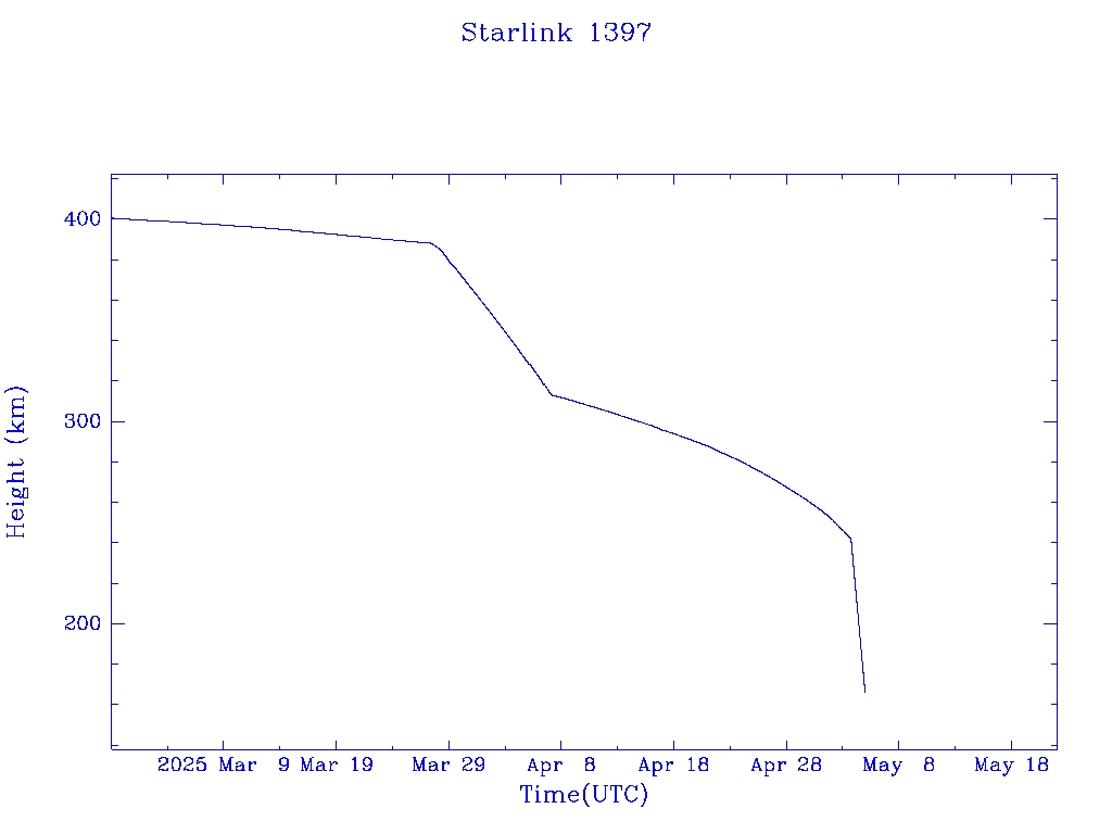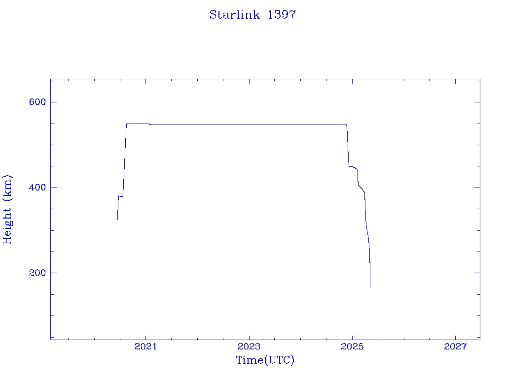 | Starlink 1397 | S45682 | R | 2020 Jun 4 | 2025 May 3? | 2025 May 5 |  |  |  |