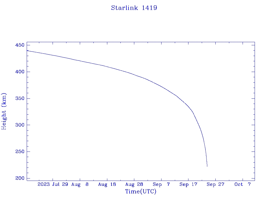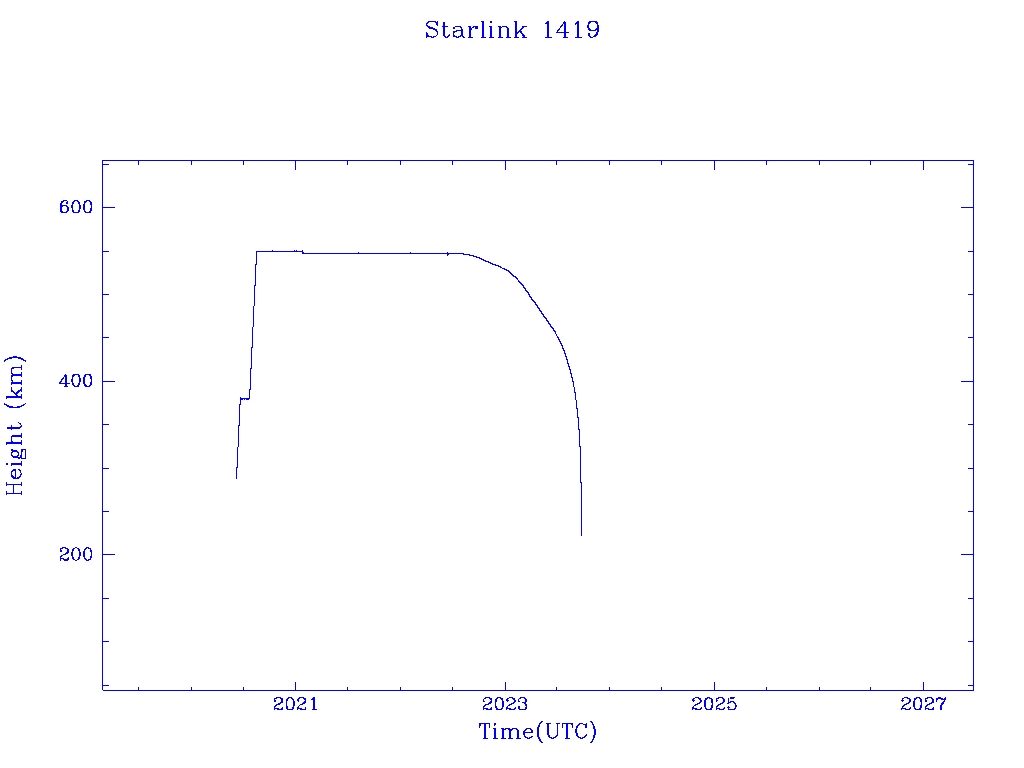 | Starlink 1419 | S45694 | M | 2020 Jun 4 | 2022 Aug 10 | 2023 Sep 24 |  |  |  |