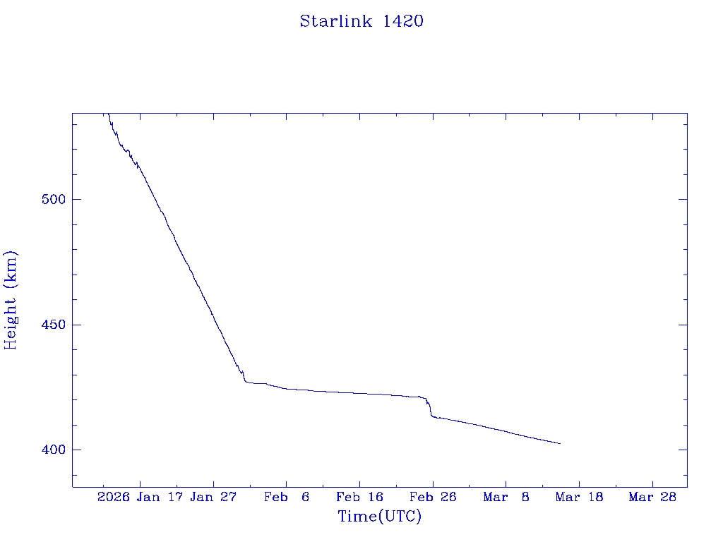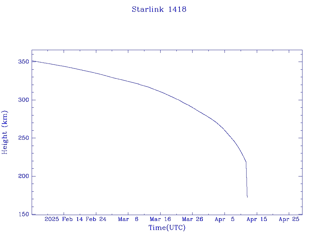 | Starlink 1418 | S45708 | R | 2020 Jun 4 | 2025 Jan 26? | 2025 Apr 12 |  |  |  |