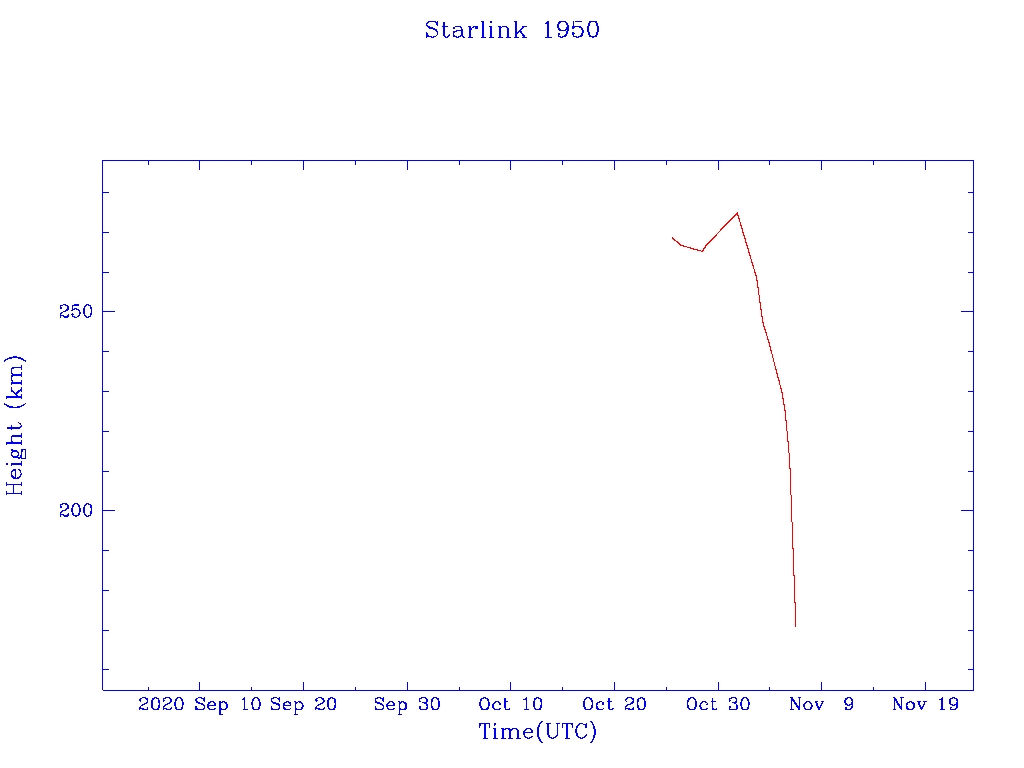 | Starlink 1950 | S46778 | F | 2020 Oct 24 | 2020 Nov 6? | 2020 Nov 6 |  |  |  |