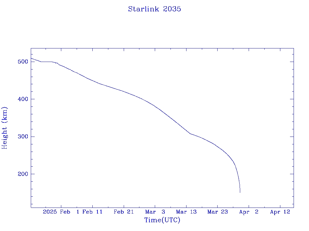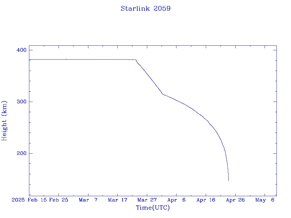 | Starlink 2059 | S47668 | R | 2021 Feb 16 | 2025 Apr 1? | 2025 Apr 23 |  |  |  |