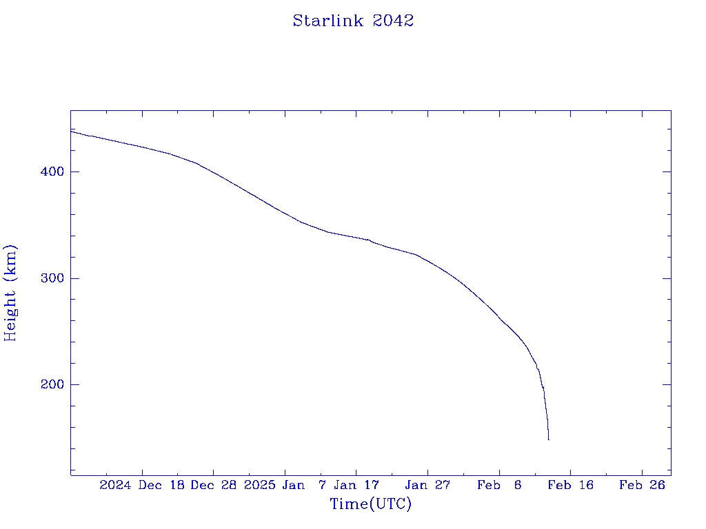 | Starlink 2042 | S47658 | R | 2021 Feb 16 | 2025 Jan 25? | 2025 Feb 13 |  |  |  |