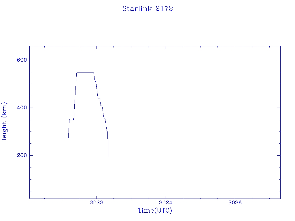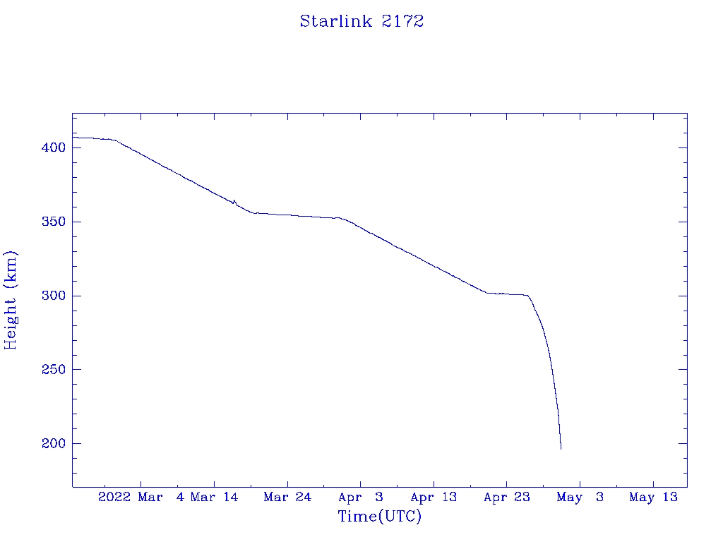 | Starlink 2172 | S47755 | R | 2021 Mar 4 | 2022 Apr 25 | 2022 Apr 30 |  |  |  |