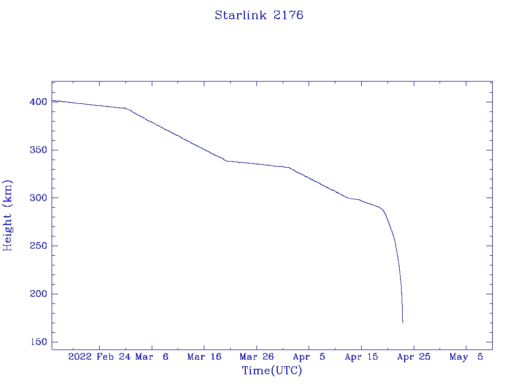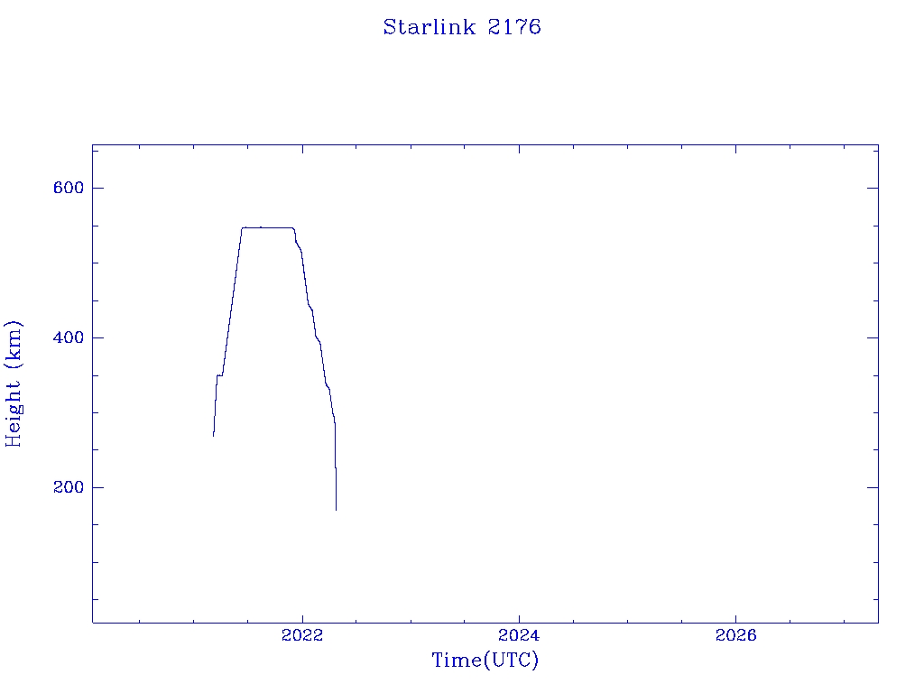 | Starlink 2176 | S47758 | R | 2021 Mar 4 | 2022 Apr 18 | 2022 Apr 22 |  |  |  |