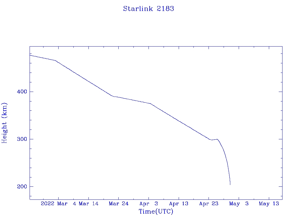 | Starlink 2183 | S47765 | R | 2021 Mar 4 | 2022 Apr 26 | 2022 Apr 30 |  |  |  |