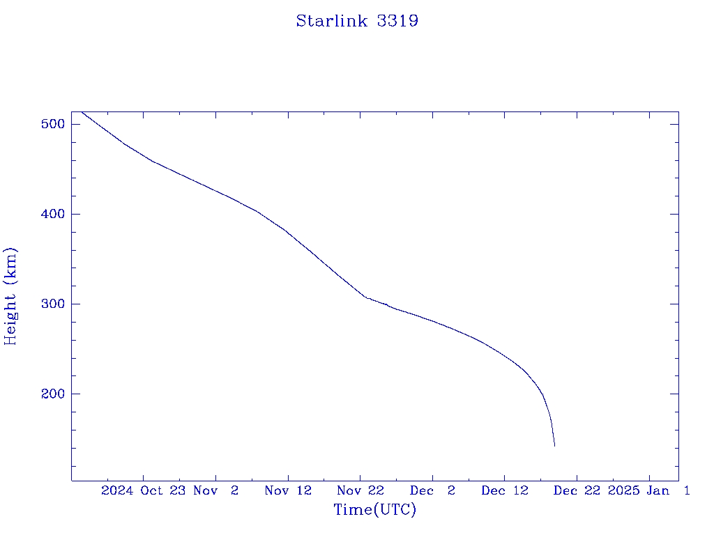 | Starlink 3319 | S50847 | R | 2022 Jan 6 | 2024 Nov 24? | 2024 Dec 19 |  |  |  |