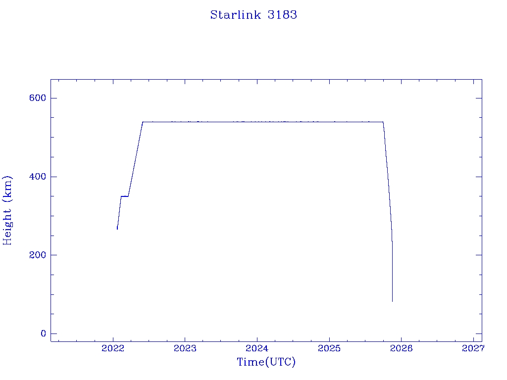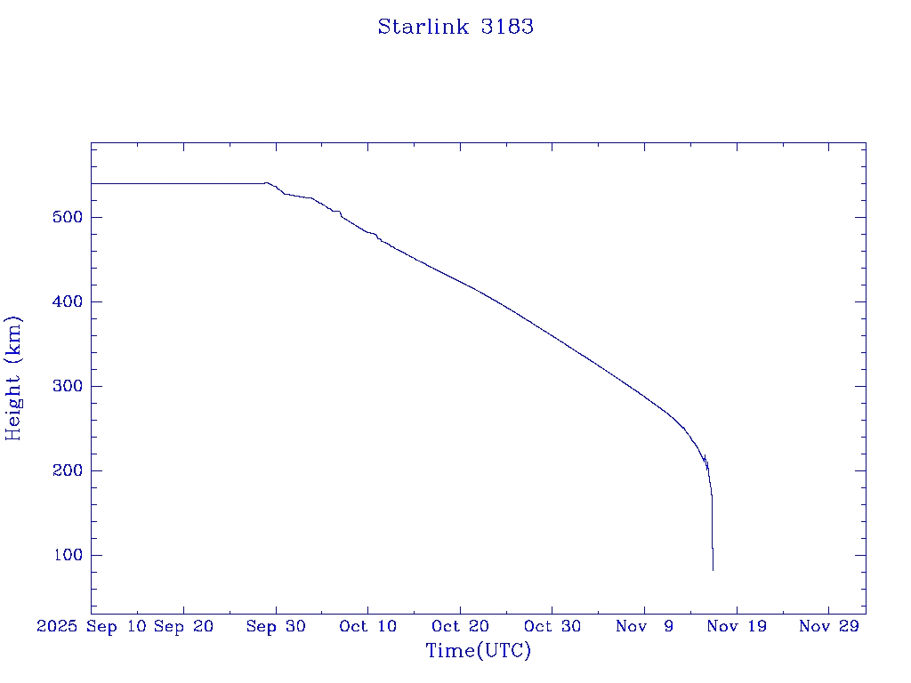 | Starlink 3183 | S51134 | R | 2022 Jan 19 | 2025 Nov 12? | 2025 Nov 16 |  |  |  |