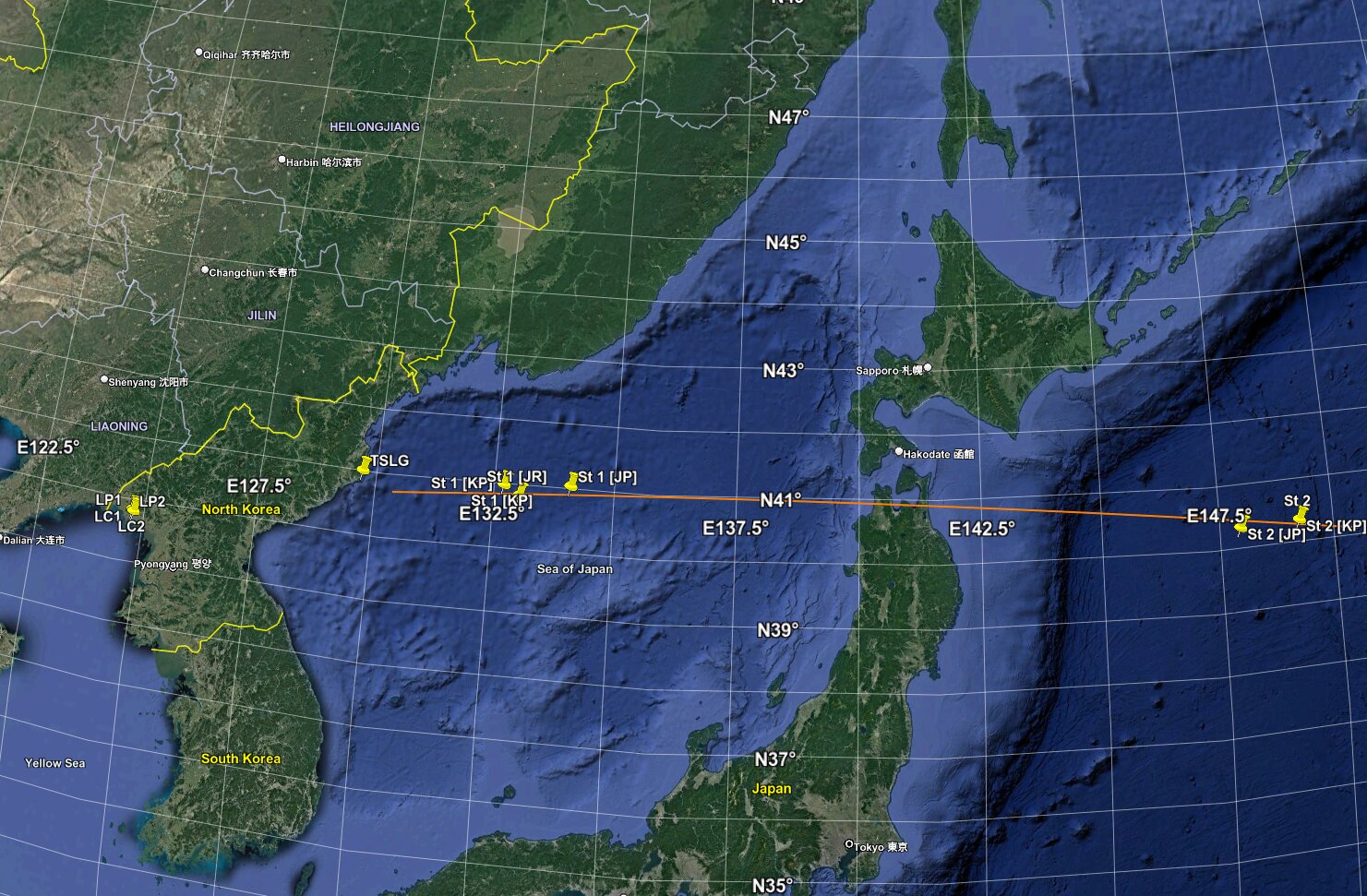 Eastward launch from Tonghae over Aomori region of Japan and over the Pacific.