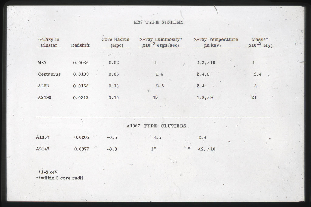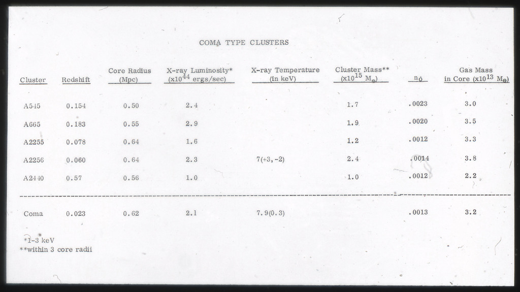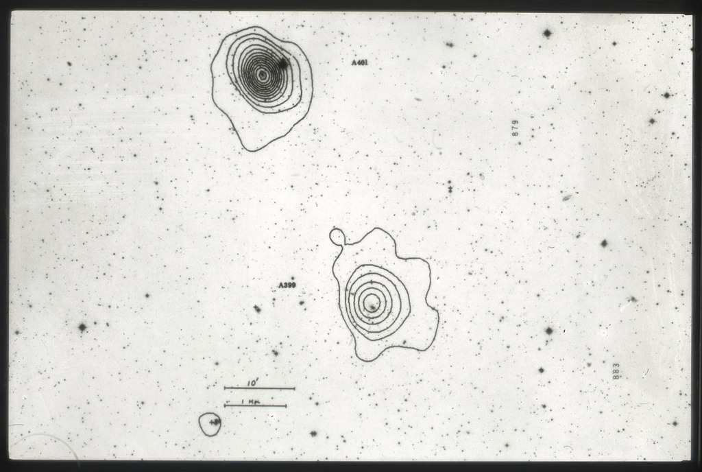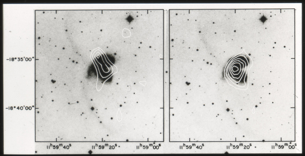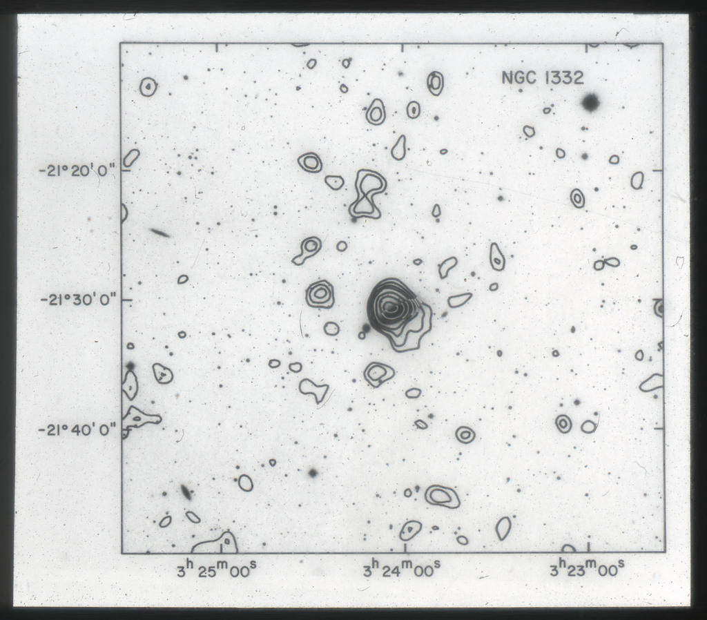 E/1003 A 1367. Optical picture of the cluster contains several hundred individual galaxies, the brightest of which are seen as the extended or fuzzy dark spots. |
