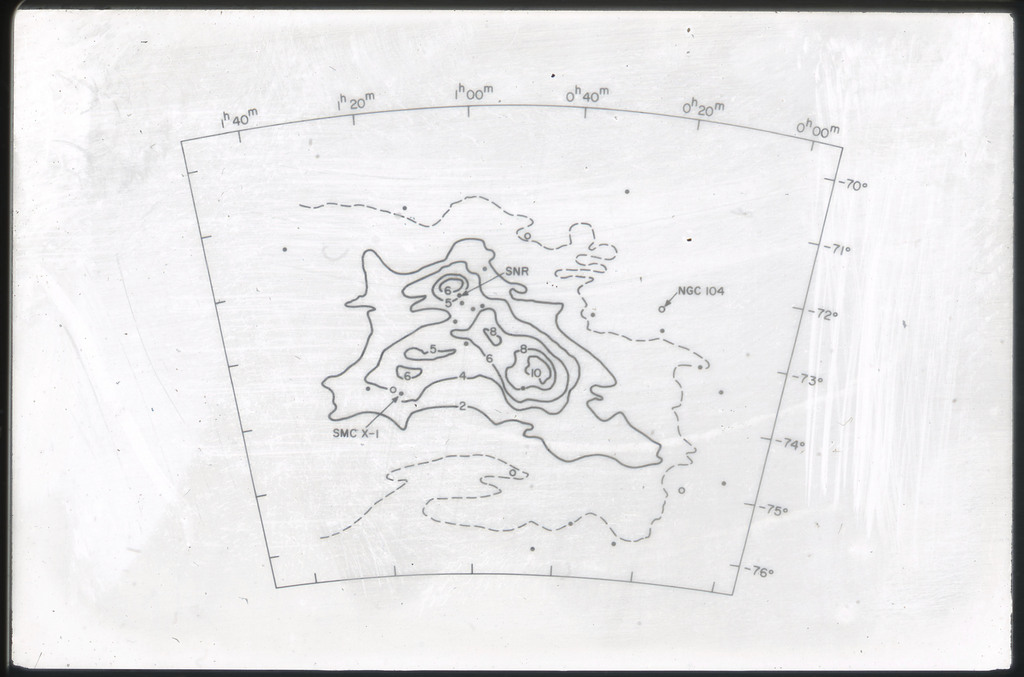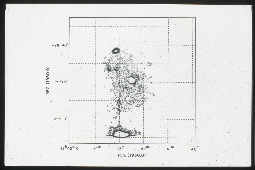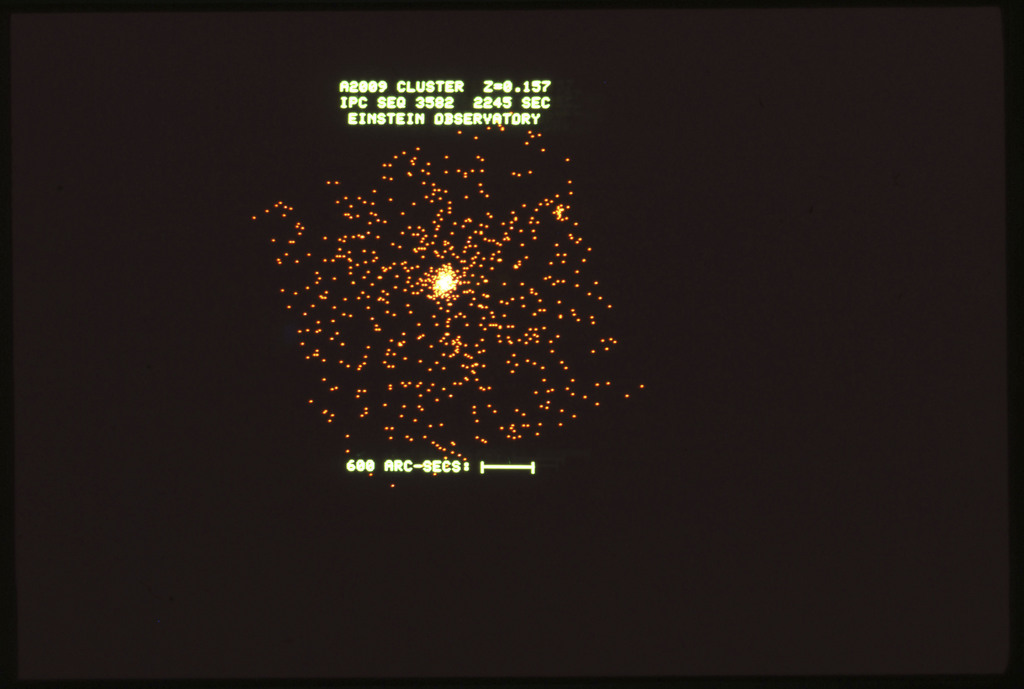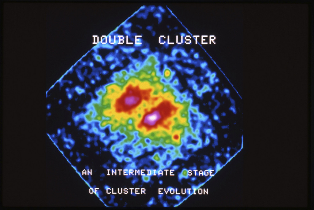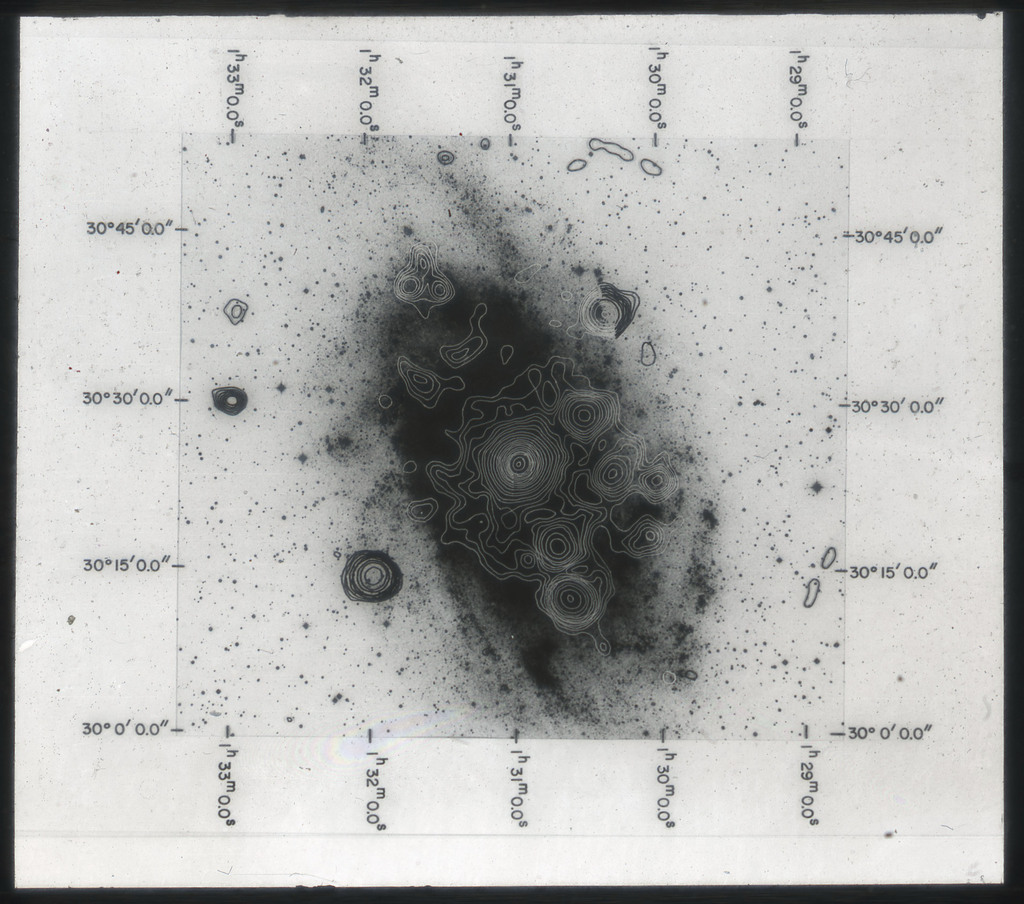 E/1003 A 1367. Optical picture of the cluster contains several hundred individual galaxies, the brightest of which are seen as the extended or fuzzy dark spots. |