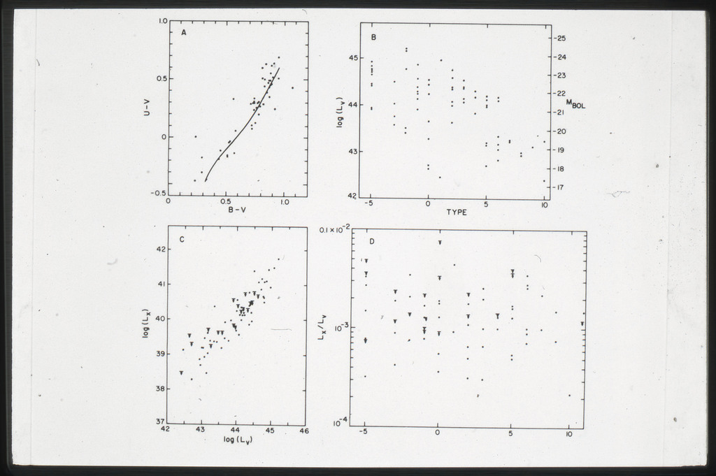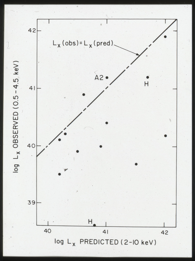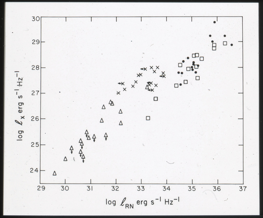 E/1001 The monochromatic X-ray luminosity is plotted against the optical luminosity for normal elliptical and S0 galaxies (this sample, x) and the 3CR galaxies (Fabbiano et al. 1984). The V band magnitudes have been used for consistency with the data for 3CR galaxies. |