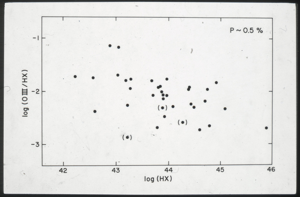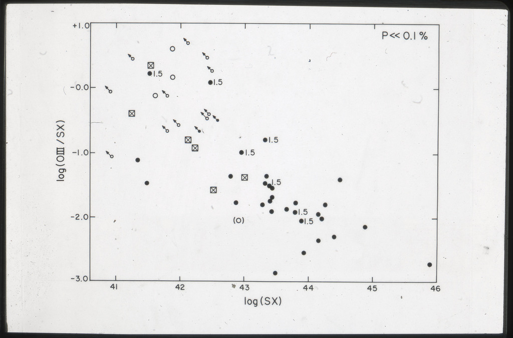 E/1002 The monochromatic X-ray luminosity of 3CR quasars and 3CR galaxies plotted as a function of optical luminosity. Dashed line represents the best fit to the 3CR quasar data. The solid lines represent how this best fit is modified when the effect of the whole galaxy is considered for three different optical luminosities. |