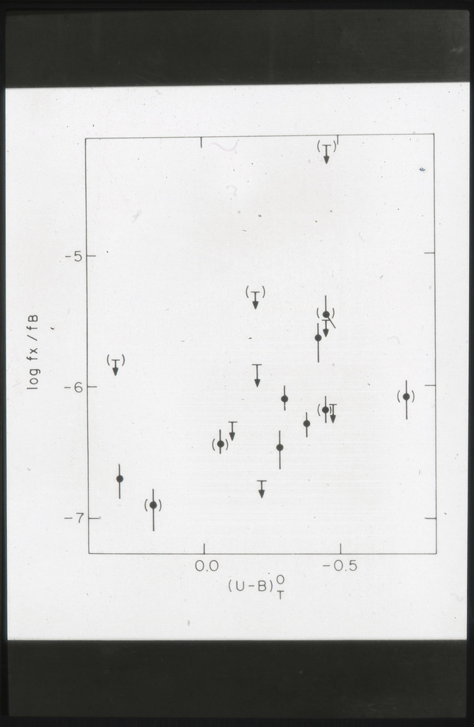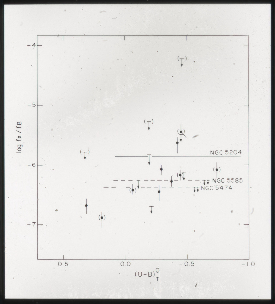 E/996 Distribution (a) of the X-ray luminosities L_x for the galaxies in the sample, and (b) Distribution of the X-ray to optical flux ratios of f_x/f_B. The hatched box represents NGC6876 for which only a Harvard Magnitude is listed in deVaucouleurs, de Vaucouleurs, and Corwin (1976). |