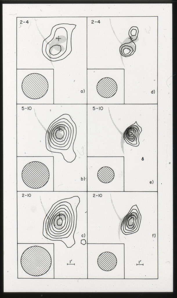 E/1004 X-ray contour map of M51 and its companion (NGC~5195) superposed on the optical image from the Hubble Atlas of Galaxies (Sandage 1961). The x-ray data have been smoothed with a gaussian with sigma = 24". The first contour is 2 sigma above field background; 3, 4, 5, 7, 9, 11, 13, 15 \sigma's are then plotted. |