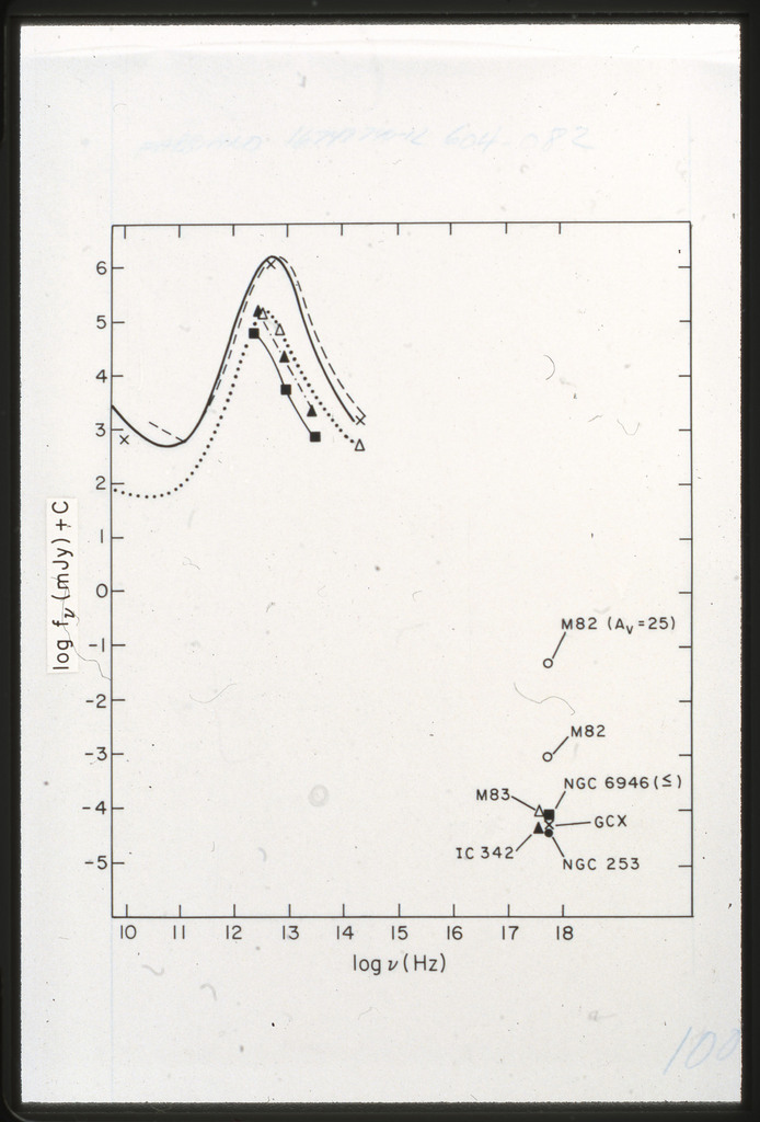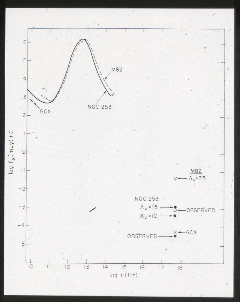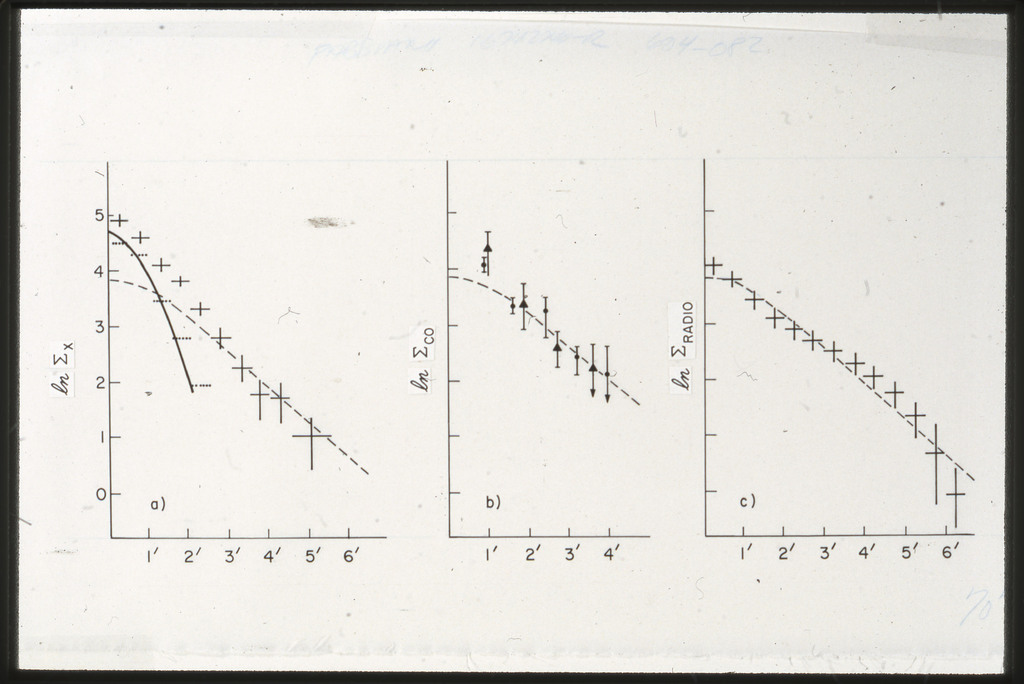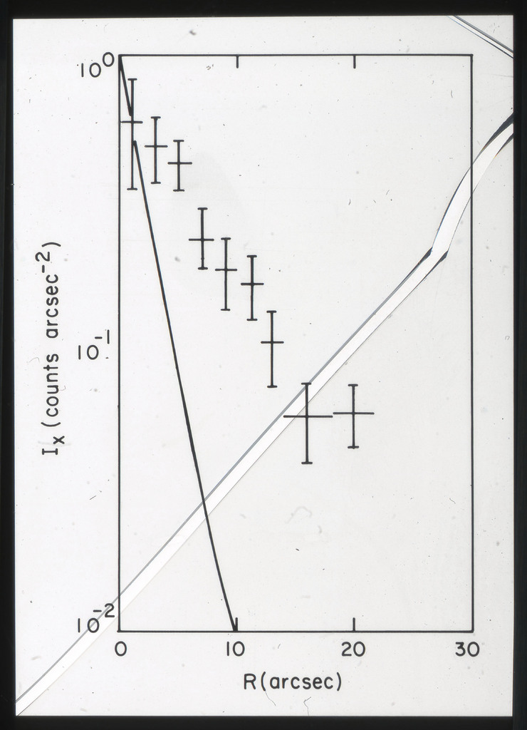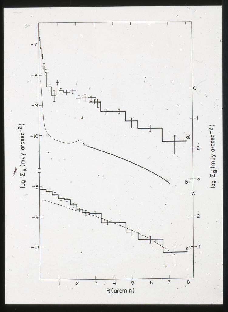 E/1008 Comparison between the x-ray, H alpha, blue light (disk and arms), far-infrared, neutral hydrogen, molecular hydrogen (derived from CO) and 21~cm radio continuum surface brightness profiles. The x-ray points are plotted on a composite of Figure~6 from Scoville and Young (1983). The x-ray data points have been corrected for the inclination of M51 (i = 20 deg) as in Scoville and Young (1983). X-ray points for R < 2~kpc are not plotted because off scale. All curves have been arbitrarily normalized. |