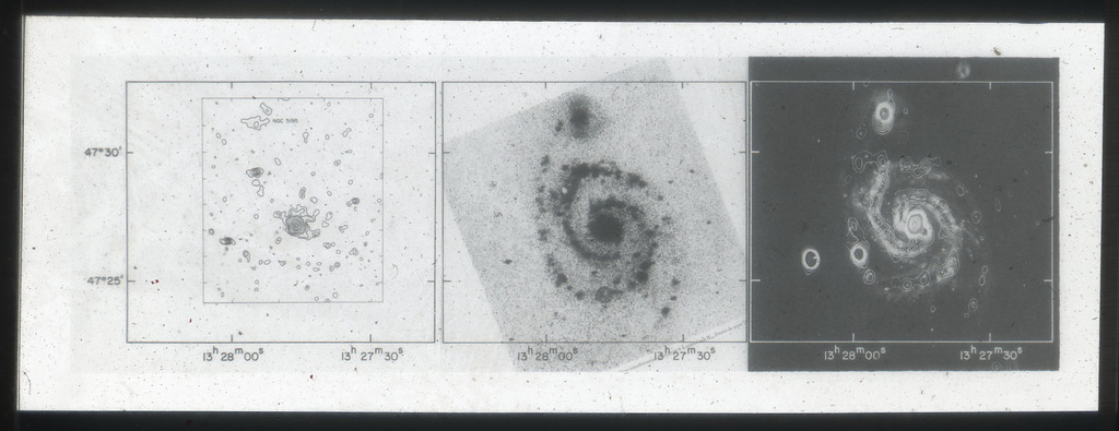 E/1005 a) X-ray contour map smoothed with a gaussian with sigma = 5". The first contour is 2 sigma above the field background. Successive contours are plotted at steps of 1 sigma over the previous one. Note that due to the smaller smoothing function, NGC~5195 is less significant than in E/1004 which suggests that the source is extended. A, B and C identify the sources of Table 1. b) H alpha photograph from Carranza, Crillon, and Monnet (1969, plate 1) on the same scale as a); c) High resolution radio continuum 21~cm map (adapted from Figure~4 in Segalovitz (1977)). The radio contours that stress the arm component are superposed on a blue photograph of M51. The scale is the same as a). |