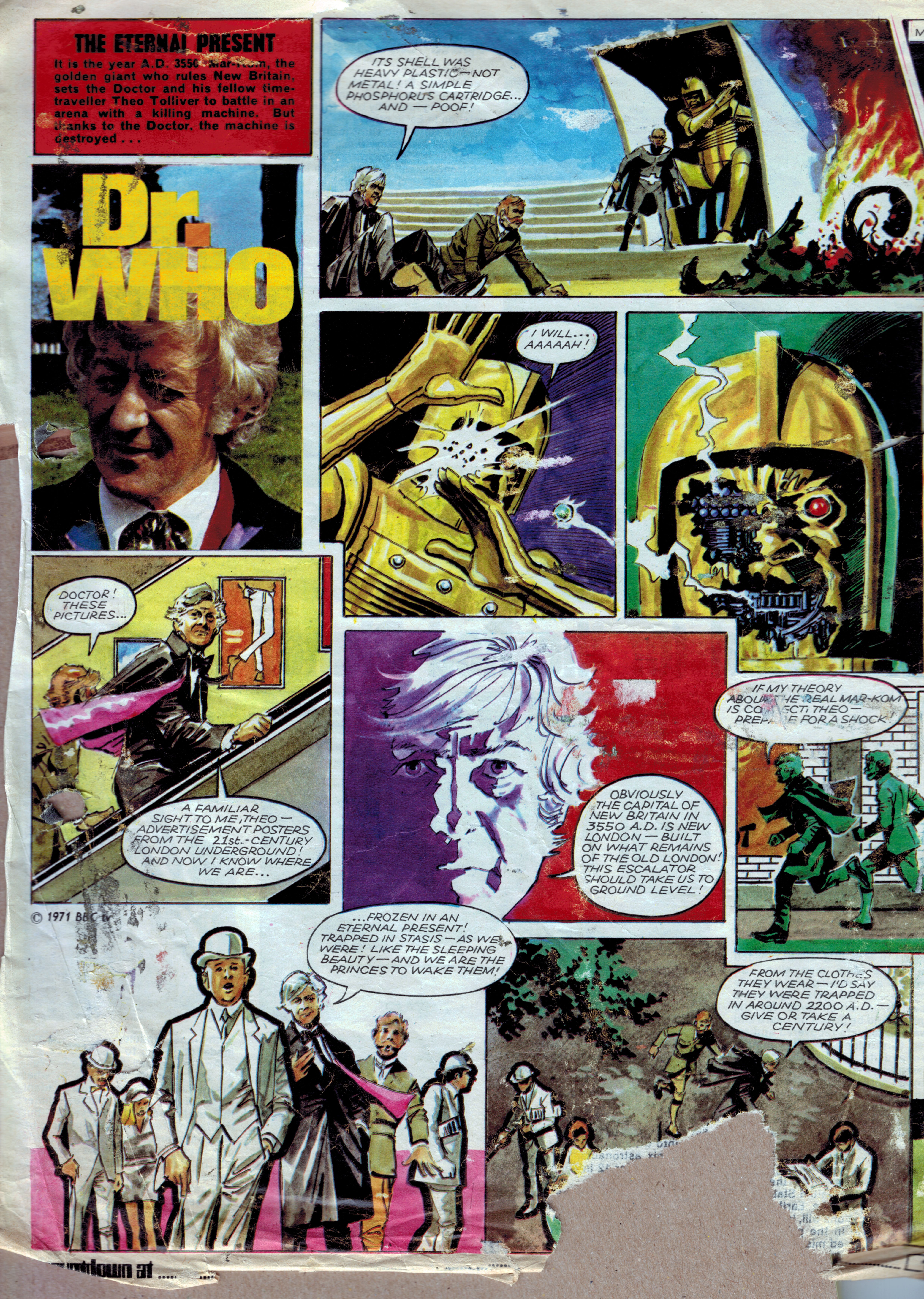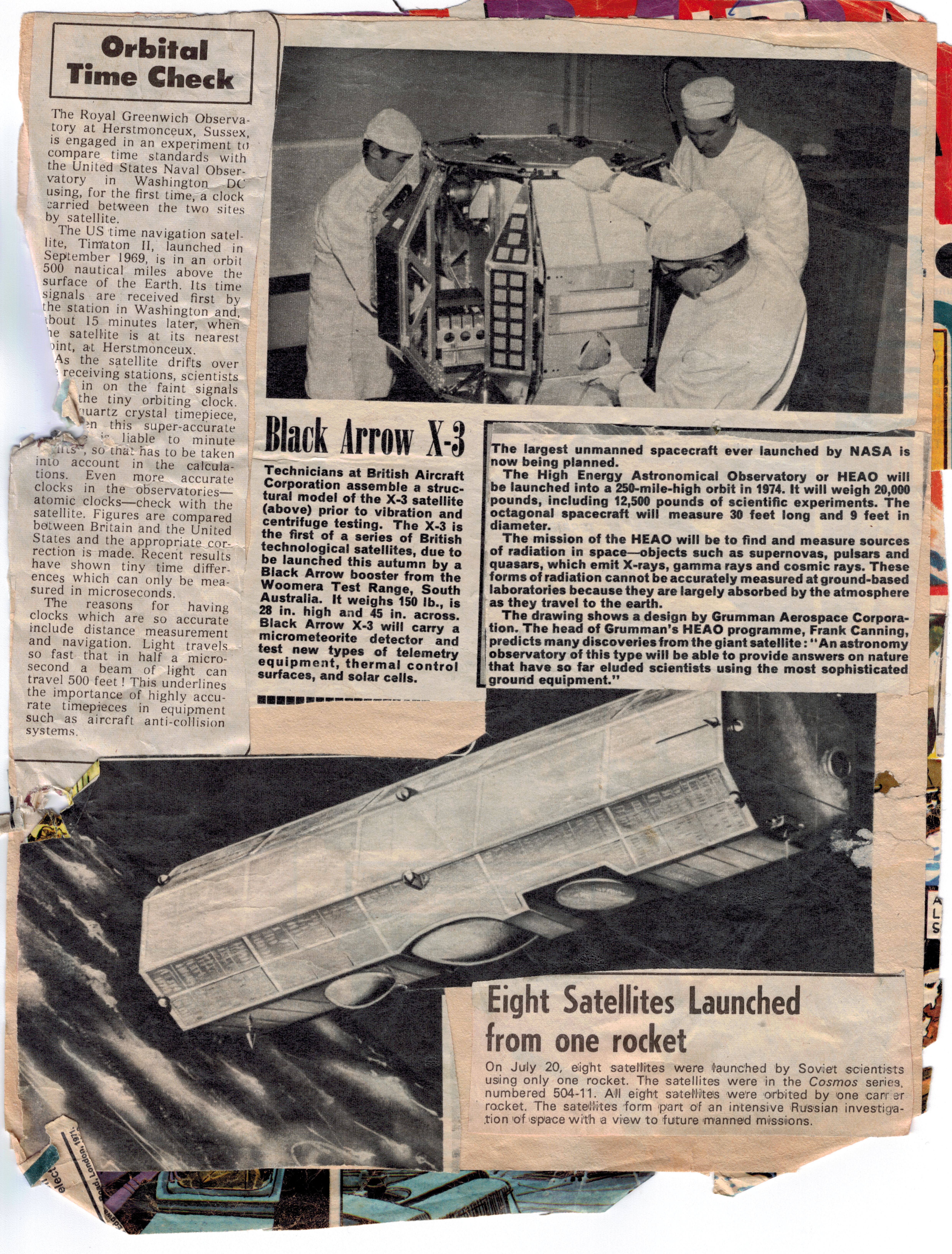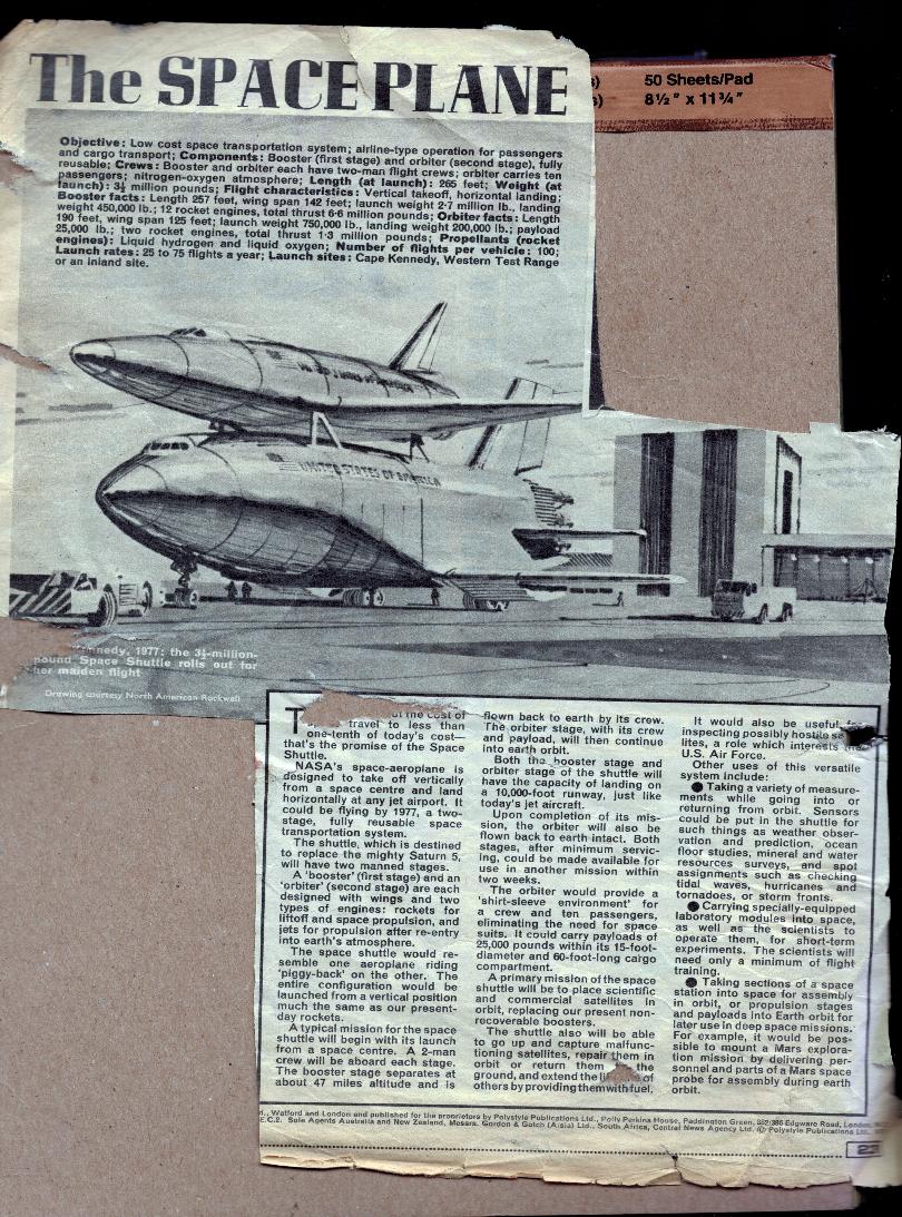 Although the parental units forced me to jettison my comic collection, I cut out the space-related articles and pasted them in a scrapbook which I still possess. I've scanned a selection of the disintegrating pages to give a sense of the high quality of these articles; I've also included fragments of the comic strips from the reverse side of the space articles. Hopefully these extracts count as a fair use subset.