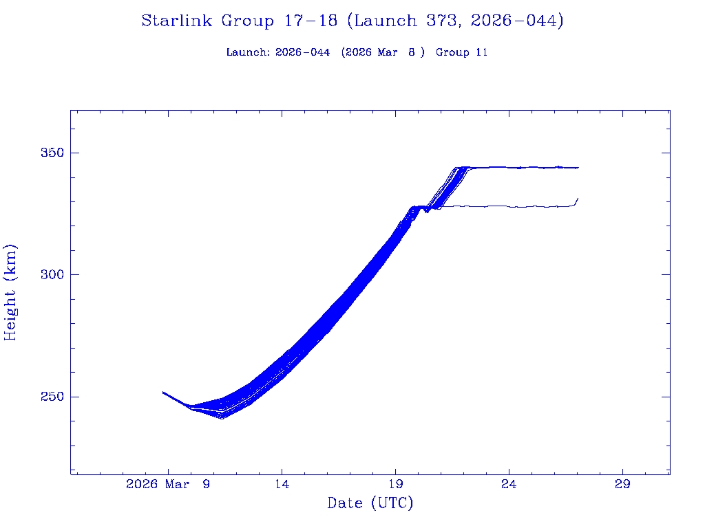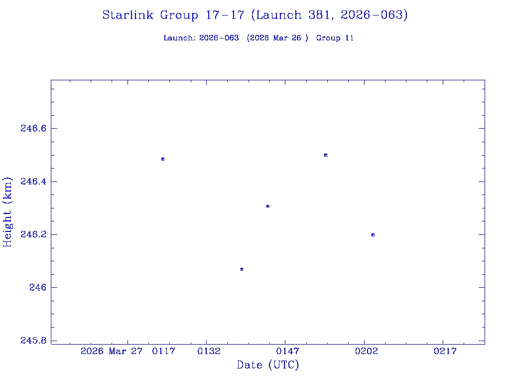 | Starlink Group 17-17 (Launch 381, 2026-063) | 25 | 0 | 0 | 0 | 0 | 0 | 25 | 0 | 0 | 0 | 25 | 0 | 0 | 0 | 0 | 0 | 25 | 0 | 0 |  |  |  |
