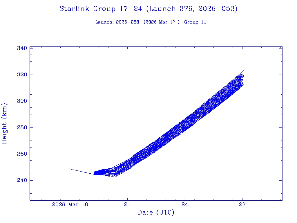 | Starlink Group 17-24 (Launch 376, 2026-053) | 25 | 0 | 0 | 0 | 0 | 0 | 25 | 0 | 0 | 0 | 25 | 0 | 0 | 0 | 0 | 0 | 0 | 25 | 0 |  |  |  |